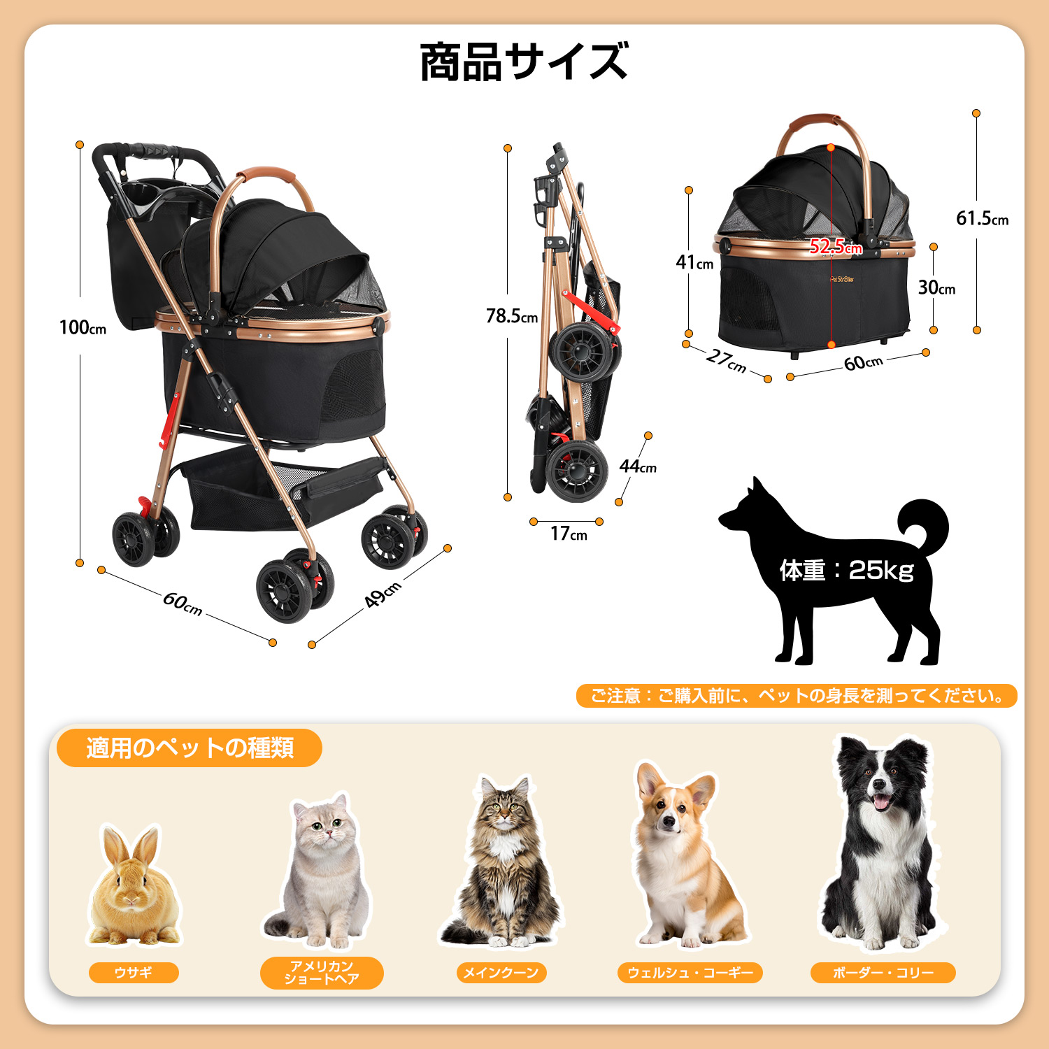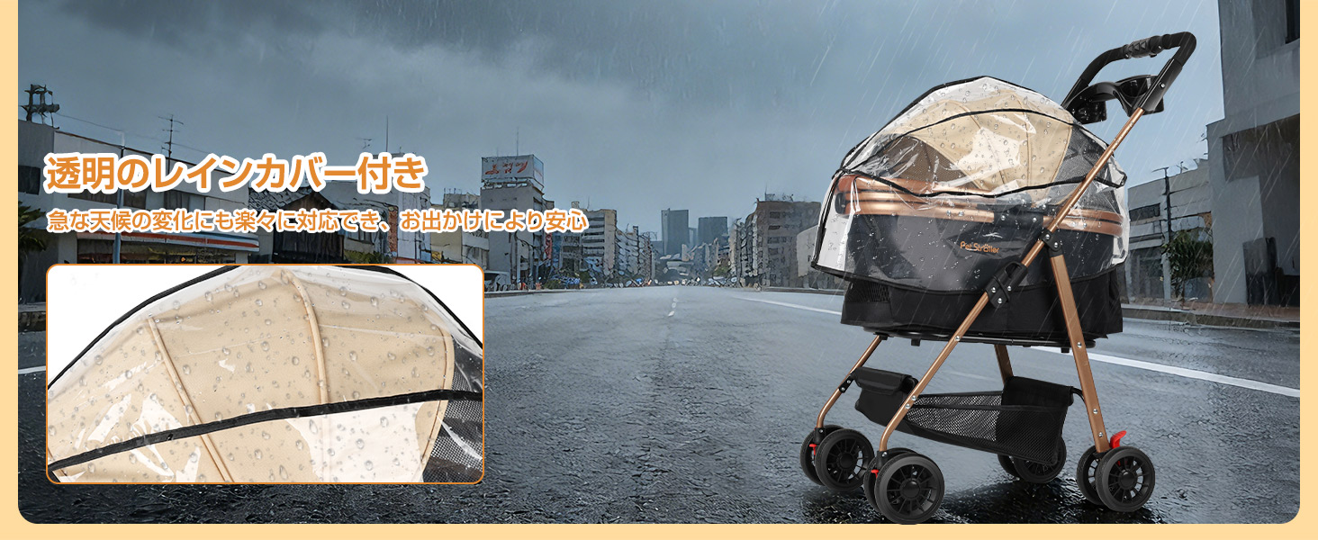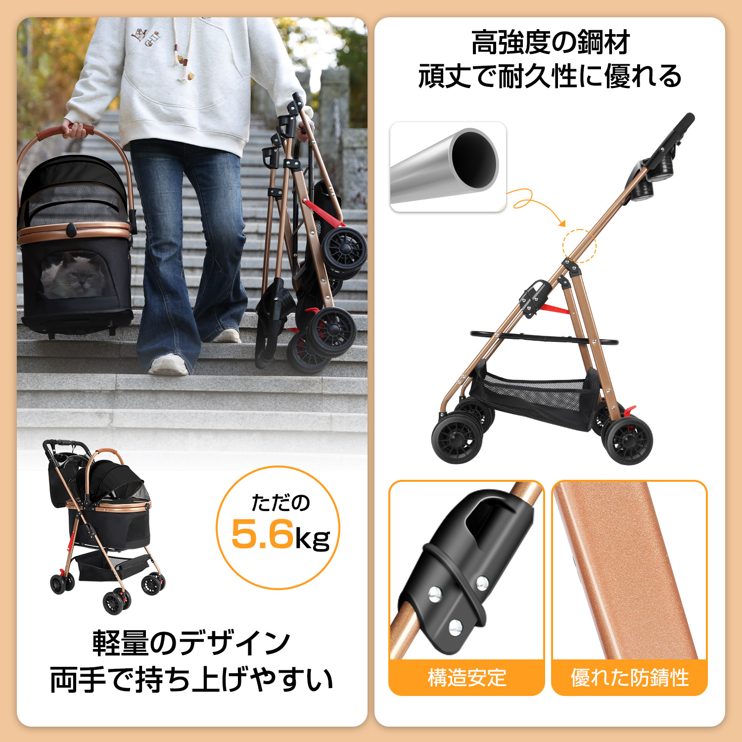 ペットカートのフレームは高強度の鋼材を採用し、メッキ加工も施しております。構造が安定して変形しにくい仕様です。カートの最大耐荷重は約25kgで、小型・中型犬や猫など幅広いペットに適しており、長く安心してご使用いただけます。