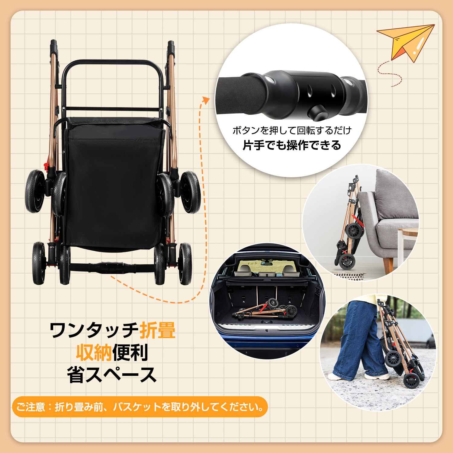 ワンタッチで折り畳みが可能で、初心者でも片手で簡単に操作できます。折り畳んだ後、コンパクトになり、自宅の片隅や車のトランクや玄関などに場所を取らずに収納できます。