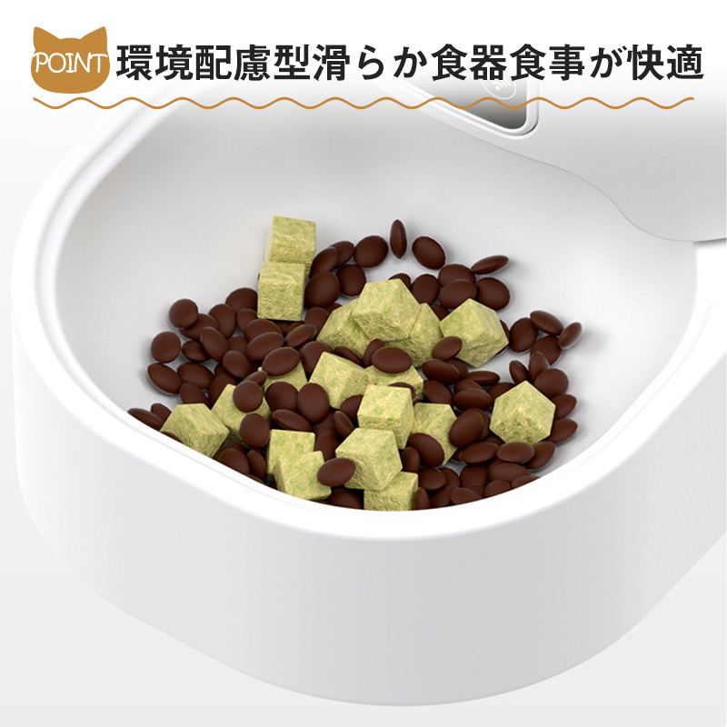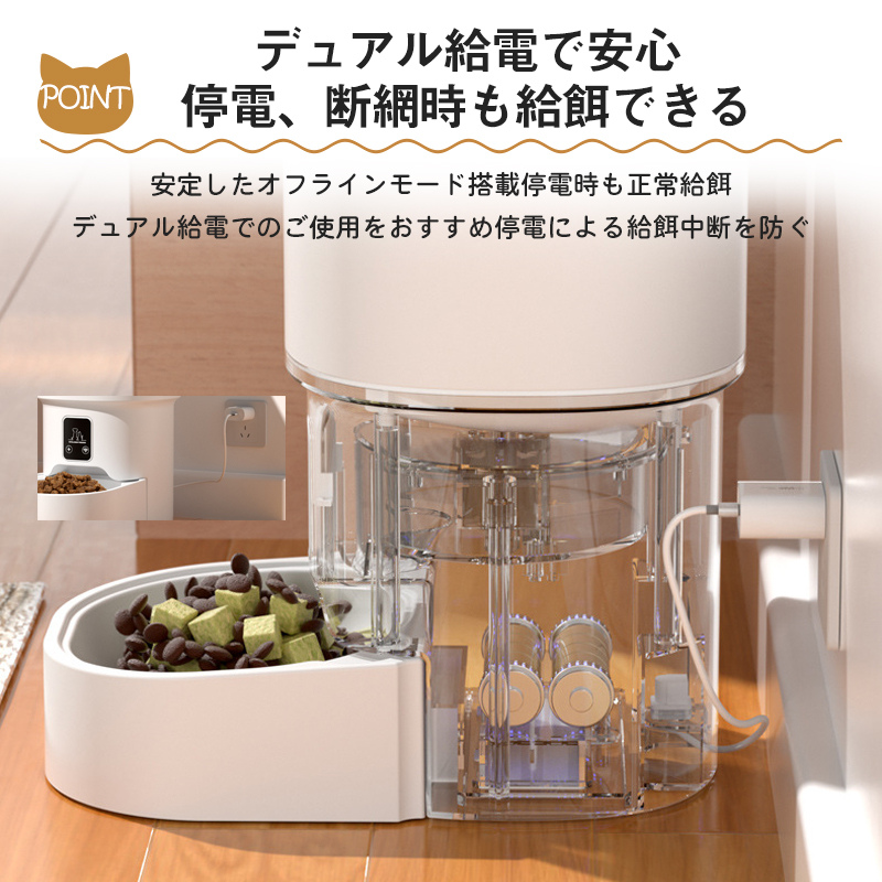 デュアル給電システム搭載で、停電時もオフラインモードで正常給餌いたします。防水素材の食器は清掃容易で、衛生と長期使用を両立しております。