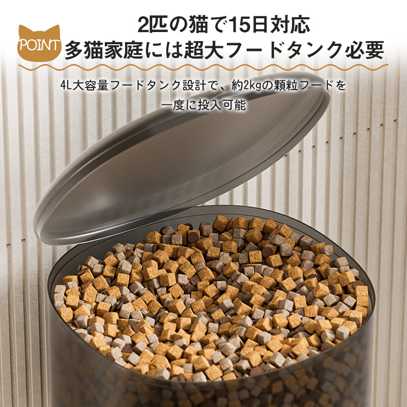 4L超大フードタンクで約2kgの顆粒フードを投入可能です。2匹の猫で約15日間連続給餌に対応し、多猫家庭や長期外出時も安心管理いただけます。