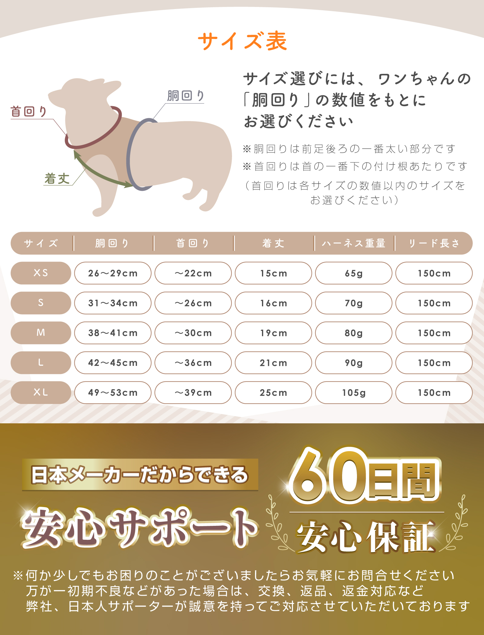 すべてのサイズに150cmのリード付きです。