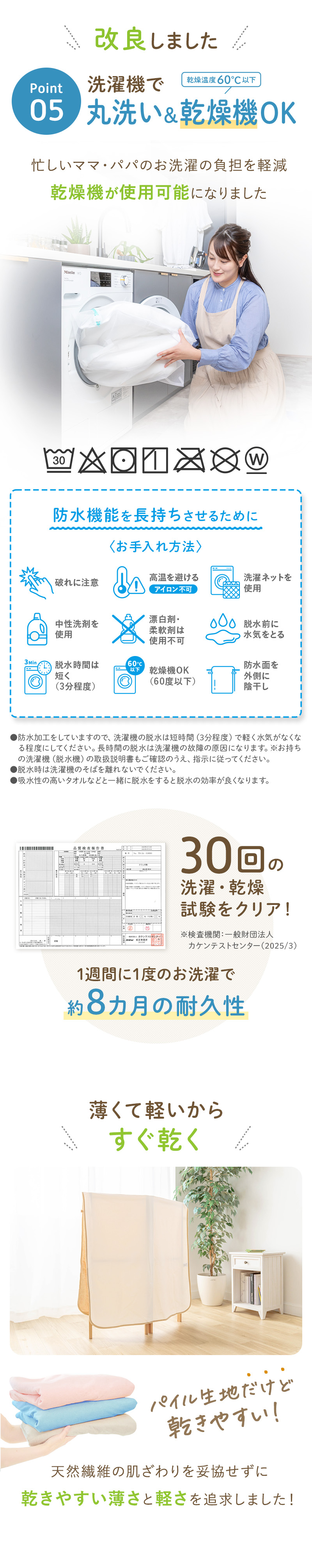 | お手入れ方法 | ・洗濯時は無蛍光中性洗剤・洗濯ネットを使用し、弱モード/短時間で洗濯脱水をしてください。 ・漂白剤・柔軟剤は使用しないでください。 ・防水加工をしていますので、洗濯機の脱水は短時間 (3分程度)で軽く水気がなくなる程度にしてください。長時間の脱水は洗濯機の故障 の原因になります。 ※お持ちの洗濯機(脱水機) の取扱説明書もご確認のうえ、指示に従ってください。 ・脱水時は洗濯機のそばを離れないでください。 ・物干し竿を使用の際は、防水面を外側にしてできるだけ広げて干してください。防水面が物干し竿に密着すると加工面がはがれる可能性があります。 ・乾燥機をご使用の際は60℃以下にして洗濯ネットに入れてください。コインランドリーやガス乾燥機は高温になりやすいため設定温度にご注意ください。 ・濃色の製品は単独洗いをしてください。 |