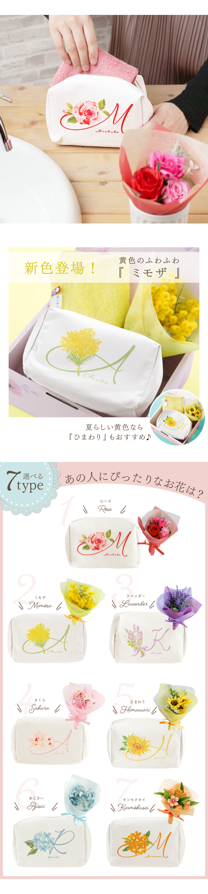 | 【イニシャルポーチ花づくしギフトセット】 気分もパッと華やかにしてくれる、ときめき花づくしギフト♪ 実用的な大容量ポーチ&安心の今治タオルハンカチ、 ポーチとお揃いのミニブーケをセットに! ■Point 1 選べるお花とイニシャル、お名前を組み合わせた当店オリジナルデザインのポーチ♪ 大容量なのでカバンの中身をすっきり整理できます。 メイクポーチにしたり、ガジェットケースやトラベルポーチなど、使い方は様々。 しっかり自立するので、デスクに置いたまま使えて実用性もばっちり! ■Point 2 お花に合わせたカラーの今治タオルハンカチ。 好みに左右されず、どこでも使いやすいシンプルさ。 少し厚みのあるタオル地で、肌に触れたときにやわらかく、水分を優しく吸い取ってくれます。 ■Point 3 ポーチのデザインとお揃いの枯れないミニブーケ。 横浜のお花屋さんこだわりのアートフラワーなので、 まるで本物のような美しさがずっと続く♪ ■買い足し不要のギフトセット シーンによって選べるメッセージカードを華やかなプレゼントボックスに入れてお届け。 届いてすぐにプレゼントできるので、渡す前にラッピングや手提げ袋を買い足す必要はありません。 名入れ イニシャルポーチ 花づくしギフトセット は、誕生プレゼント 記念日 退職祝い 長寿祝い の贈り物、お母さん おばあちゃん 女友達 など 女性 へのプレゼント 、母の日 敬老の日 卒業祝い 入学祝い などのギフトにオススメです◎ | |