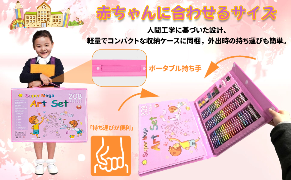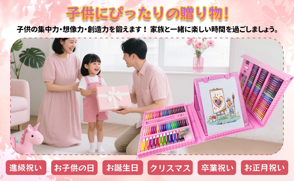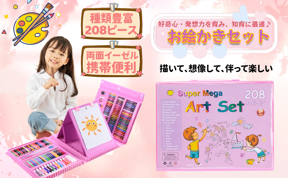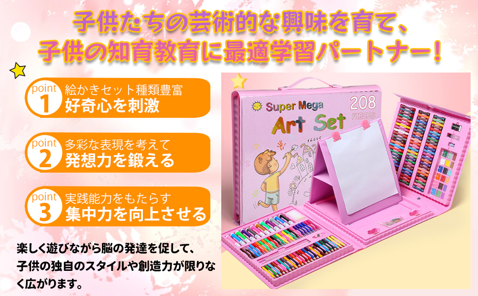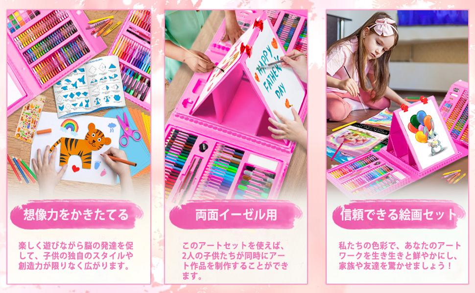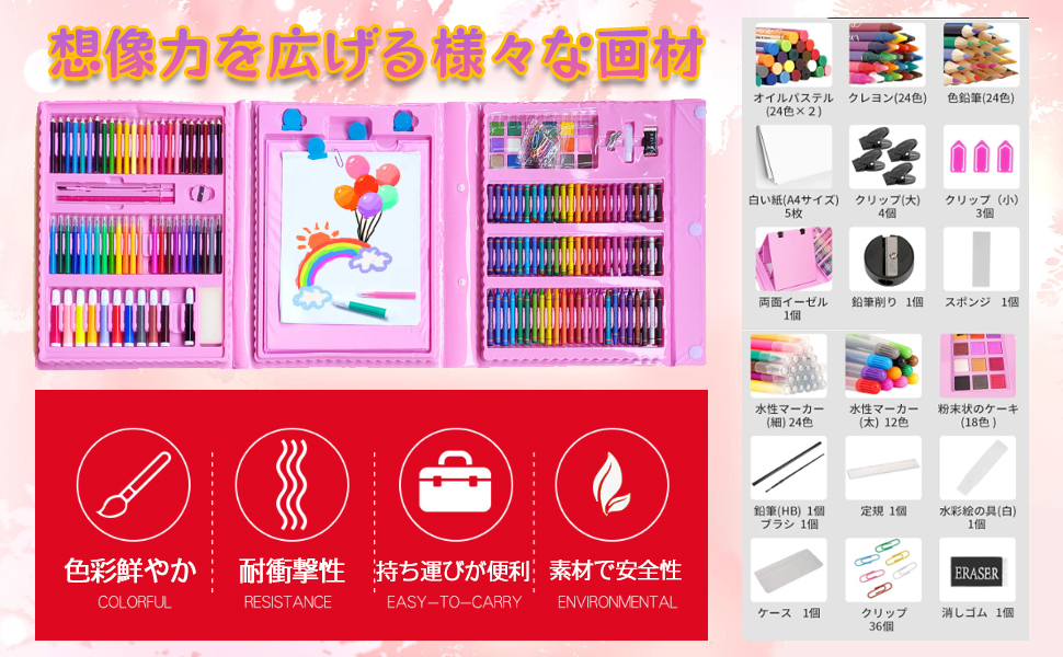 両面に紙を挟めるようになっており、2人の子供が会話しながら同時に絵を描くことができます。折りたたみ式でコンパクトになるので、持ち運びにも便利です。贈り物としては最適で、クリスマス、新年、誕生日、新学期、卒園式などのお祝いの日に、子供への理想的なプレゼントです。セット内容:A4塗り絵本×1冊 「可愛なシール付き」、オイルパステル×48、クレヨン×24、色鉛筆×24、固形水彩×18、水性マーカー(細)×24、水性マーカー(太)×12、画用紙30などです。子供の発想力、集中力、クリエイティビティ、コミュニケーション、問題解決、空間認識、視覚的認識、形や大きさ、色、文字、数字、手と目の協調など様々な能力を伸ばします。心遣いのデザインを通じて、素晴らしい芸術作品を創造してきます。