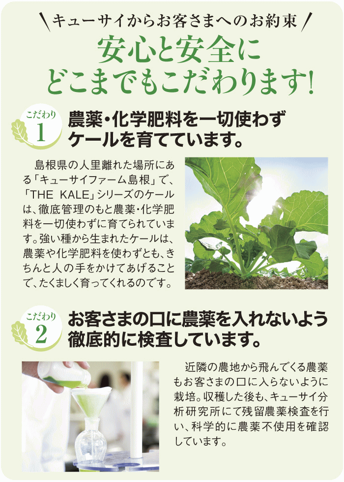 原料のケールは国内のキューサイグループファームや契約農家で、農薬を一切使わずに栽培。