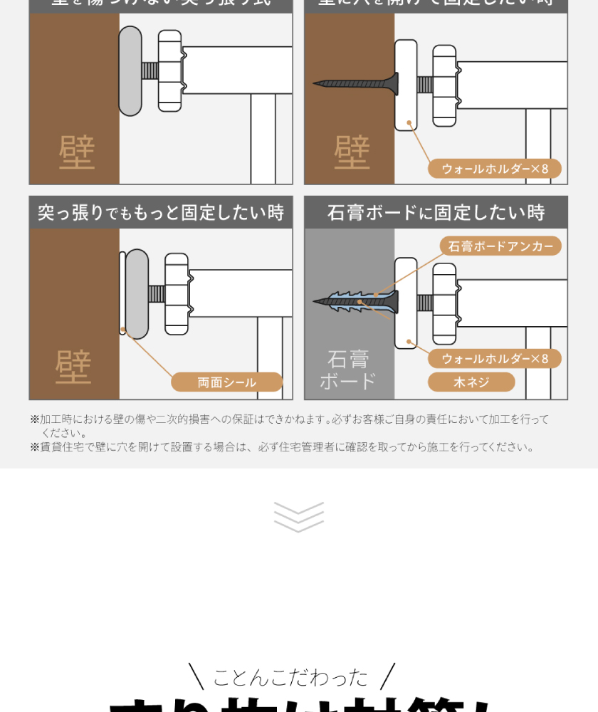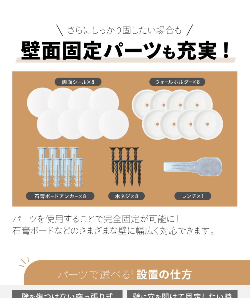 <付属品>組み立て説明書、調節ボルト、レンチ、木ネジ、石膏ボードアンカー、ウォールホルダー、両面シール