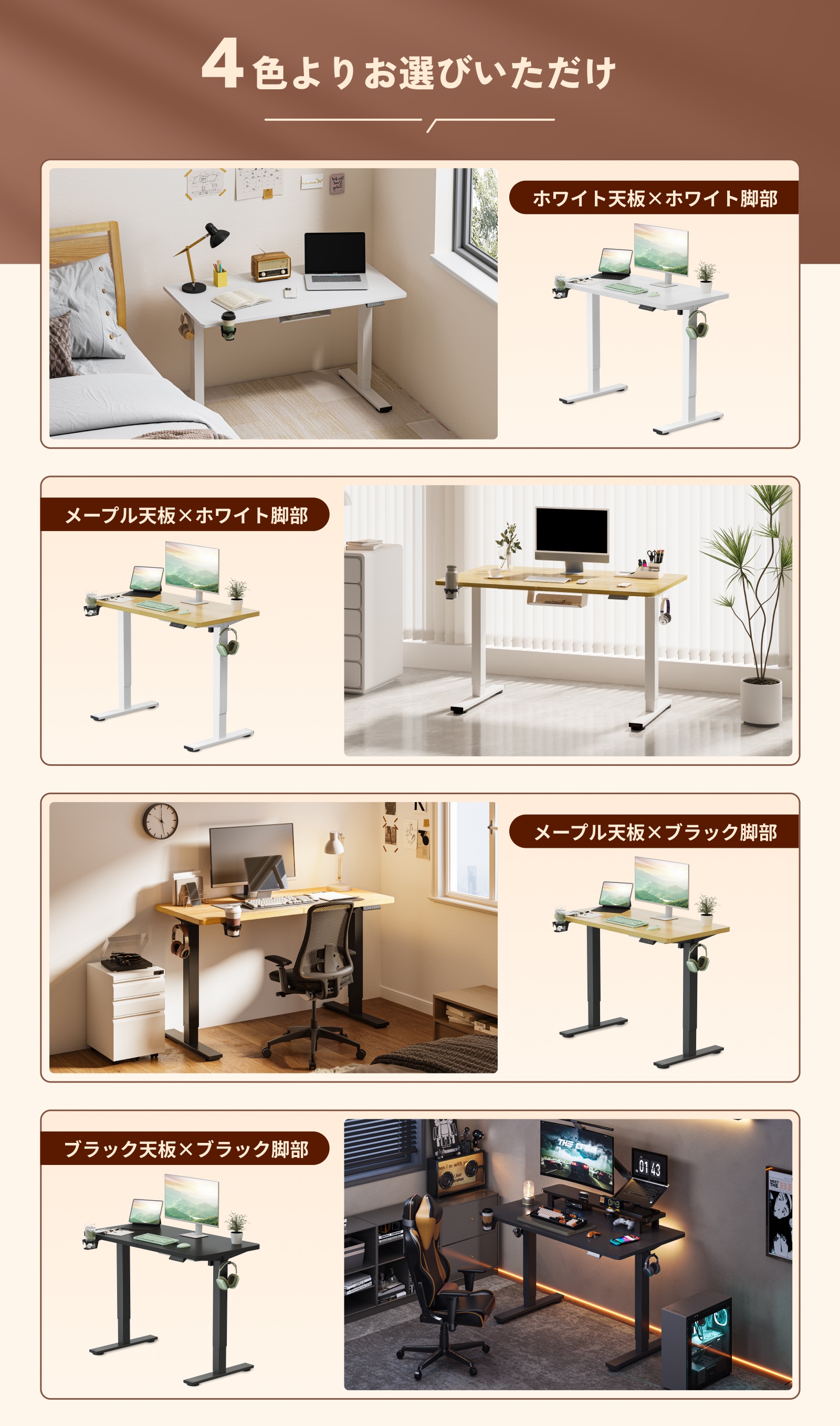 ・カラー:ブラック天板×ブラック脚部、メープル天板×ブラック脚部、メープル天板×ホワイト脚、ホワイト天板×ホワイト脚部