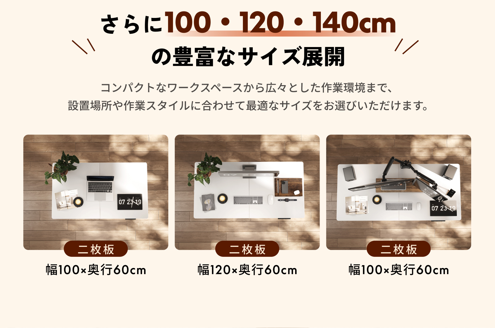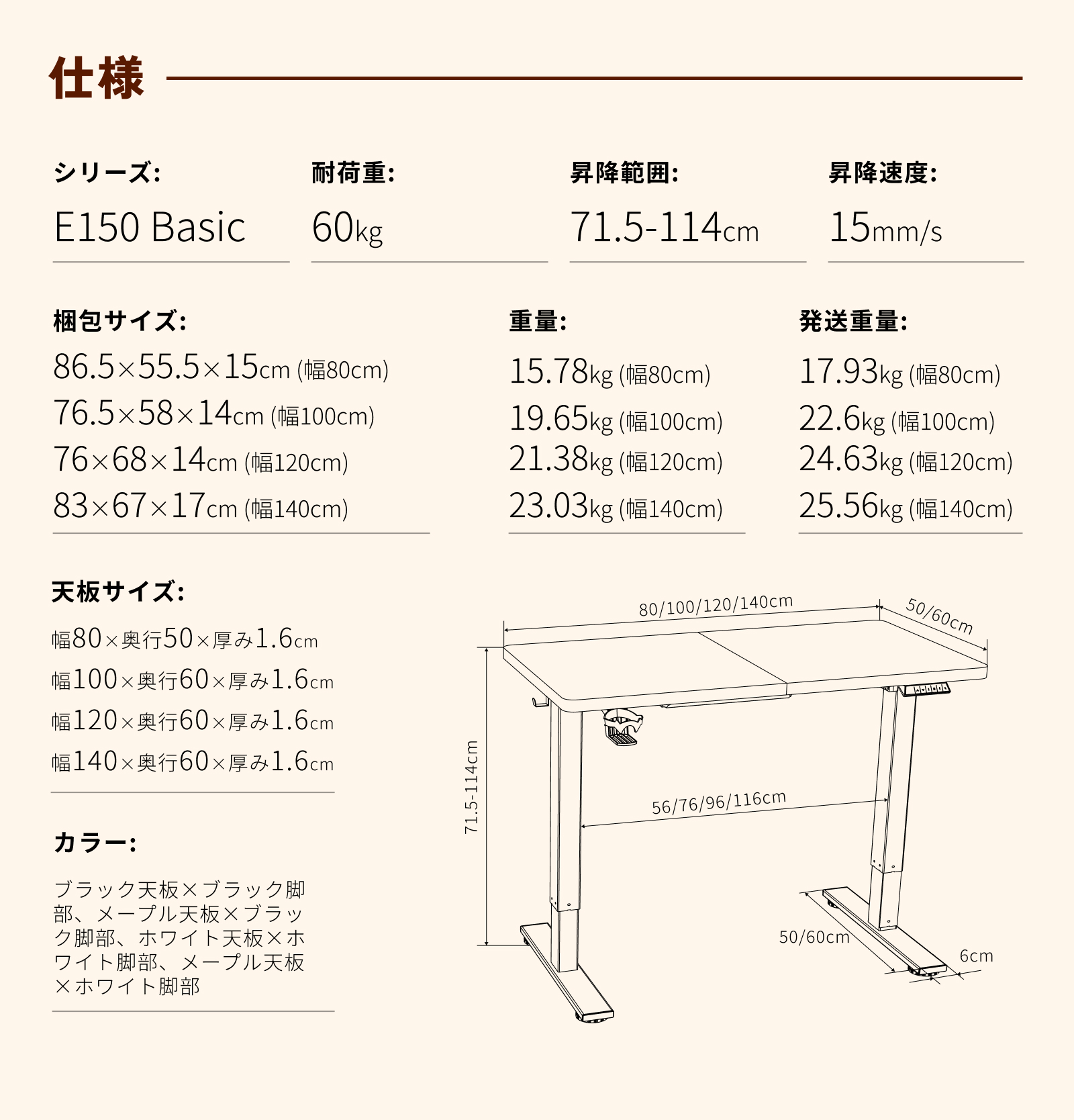 ・天板サイズ:幅80×奥行50×厚み1.6cm、幅100×奥行60×厚み1.6cm、幅120×奥行60×厚み1.6cm、幅140×奥行60×厚み1.6cm