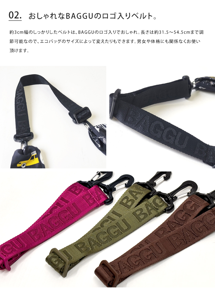 【商品説明】エコバッグで有名なブランド『BAGGU』から、持ち手に取り付けて使えるストラップが登場。肩からも斜め掛けもでき、手持ちより楽に荷物が持ち運びできます。約3cm幅のしっかりしたベルトは、BAGGUのロゴ入りでおしゃれ。長さは約31.5〜54.5cmまで調節可能なので、エコバッグのサイズによって変えたりもできます。男女や体格にも関係なくお使い頂けます。
