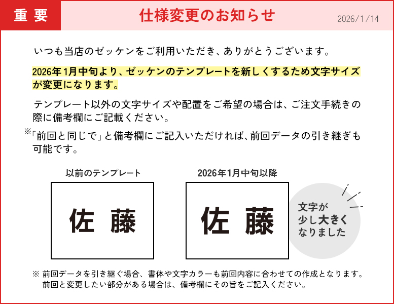 - 文字サイズに【2段】を選択いただいても、印刷内容が1段分のみの場合は【1段】中央配置で製作させていただきます。