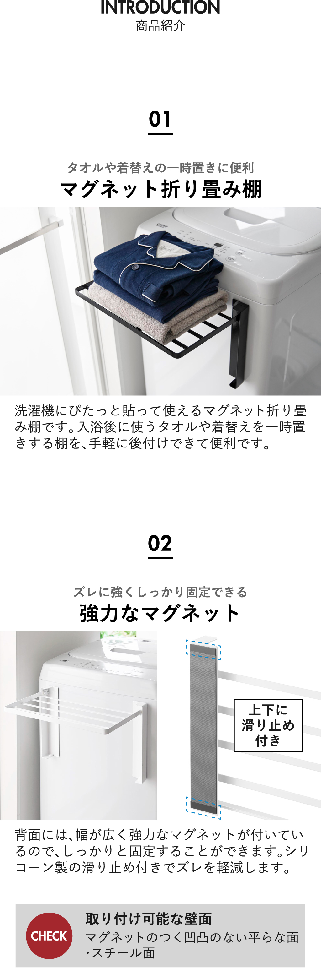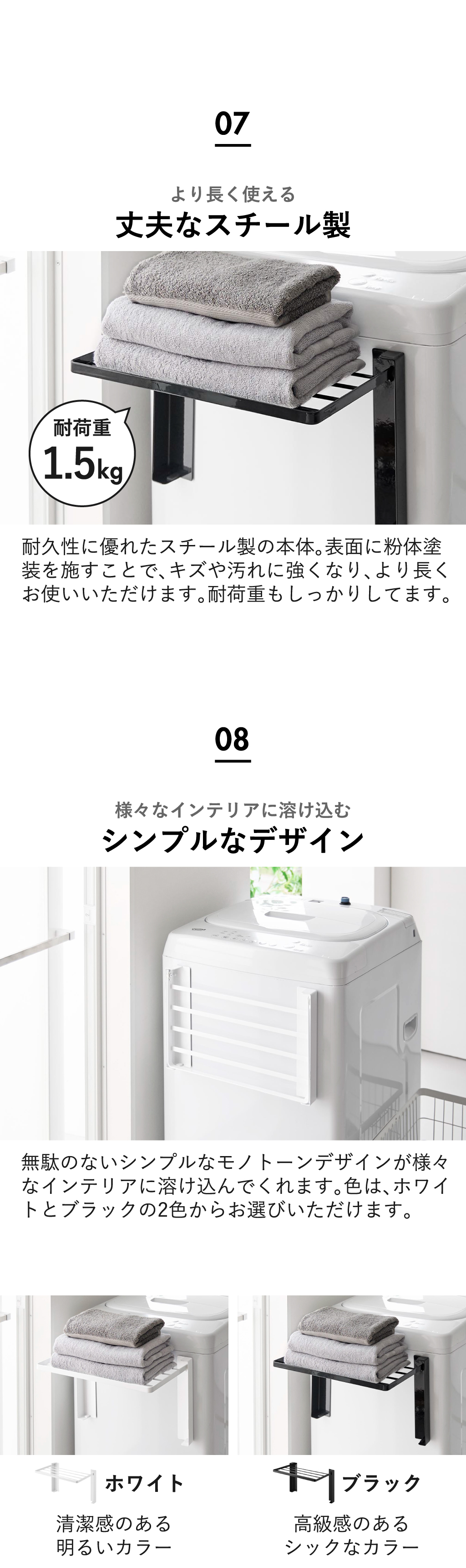 洗濯機横マグネット折り畳み棚の色は、ホワイトとブラックの2色からお選びいただけます。