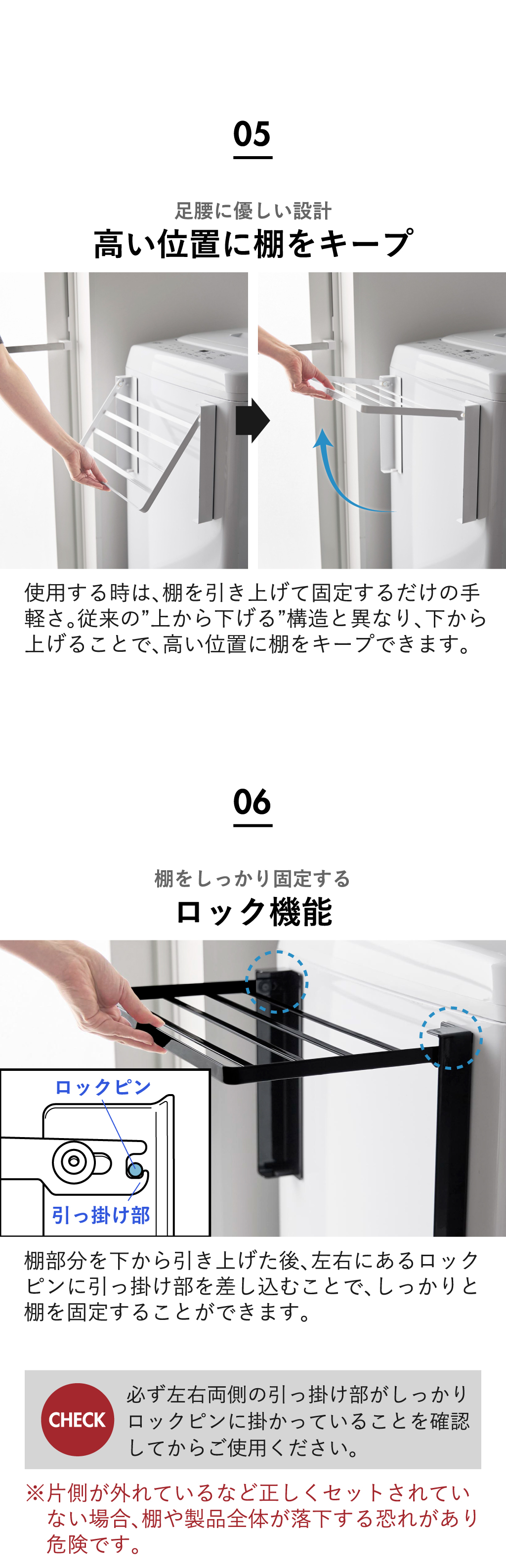 左右にあるロックピンに引っ掛け部を差し込むことで、しっかりと棚を固定できます。