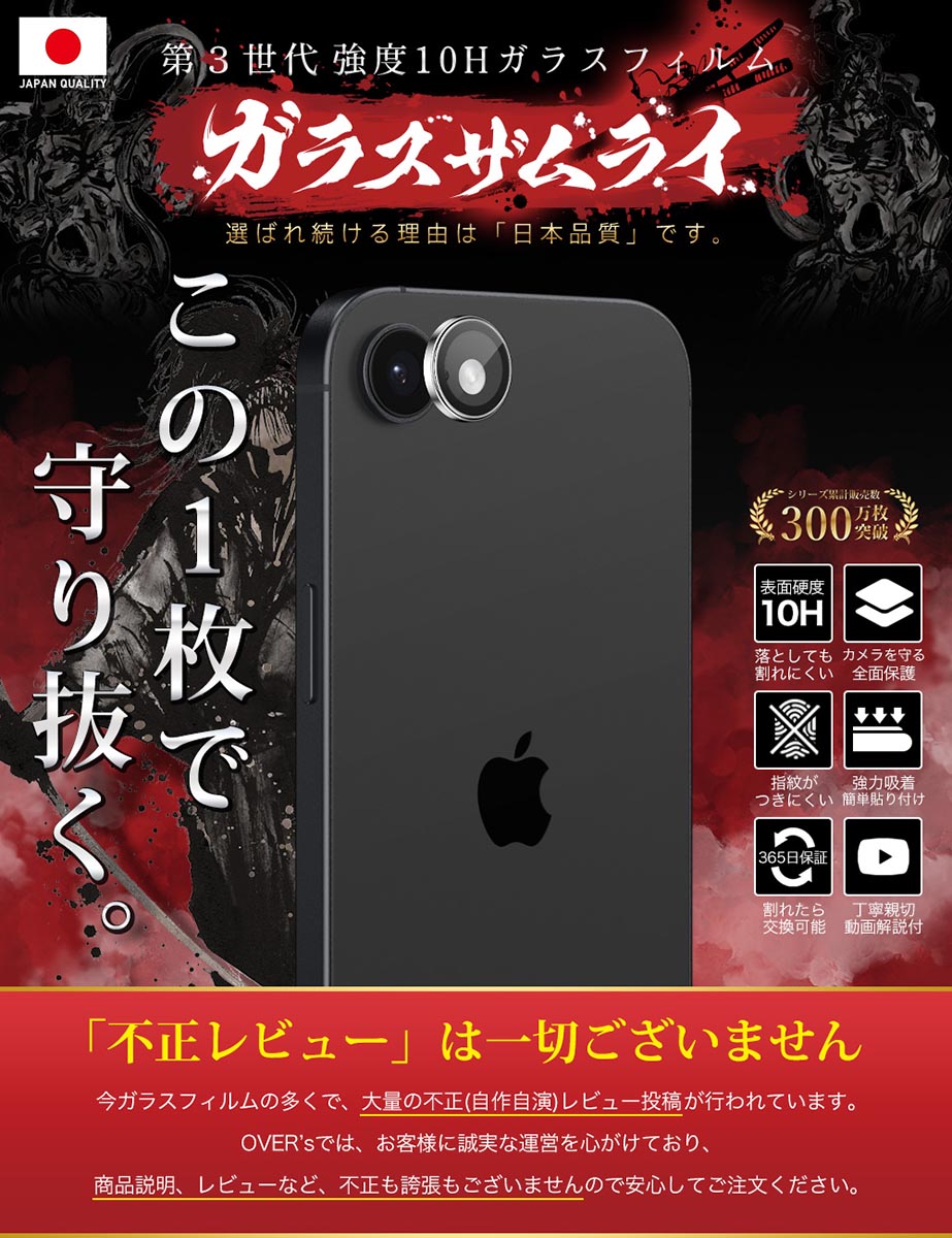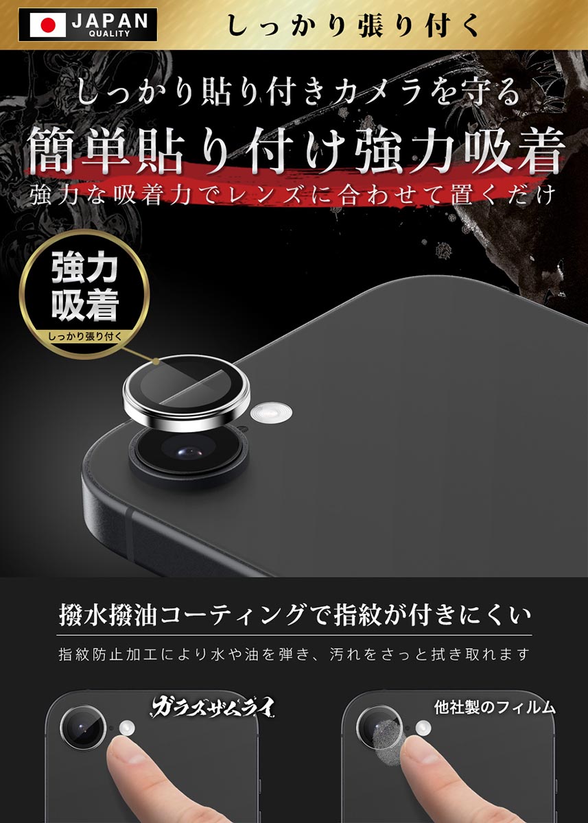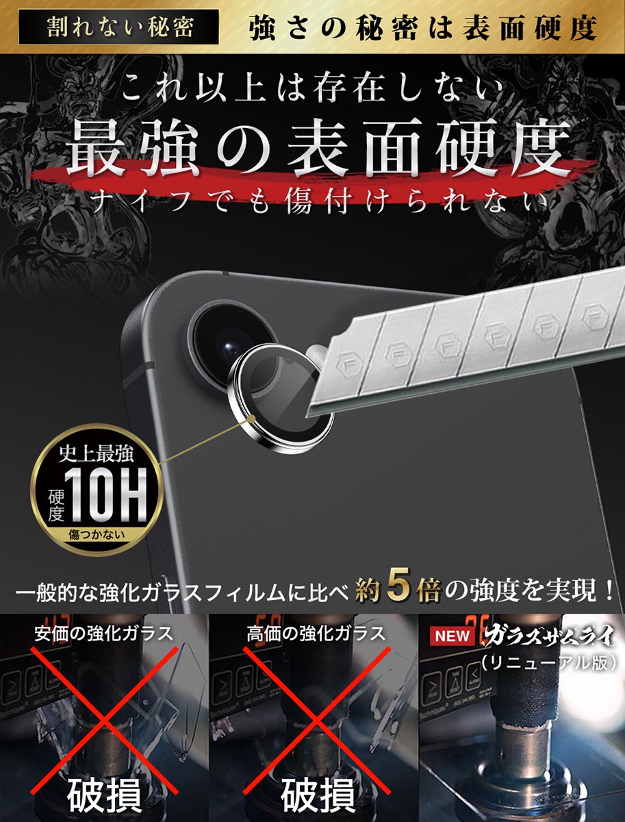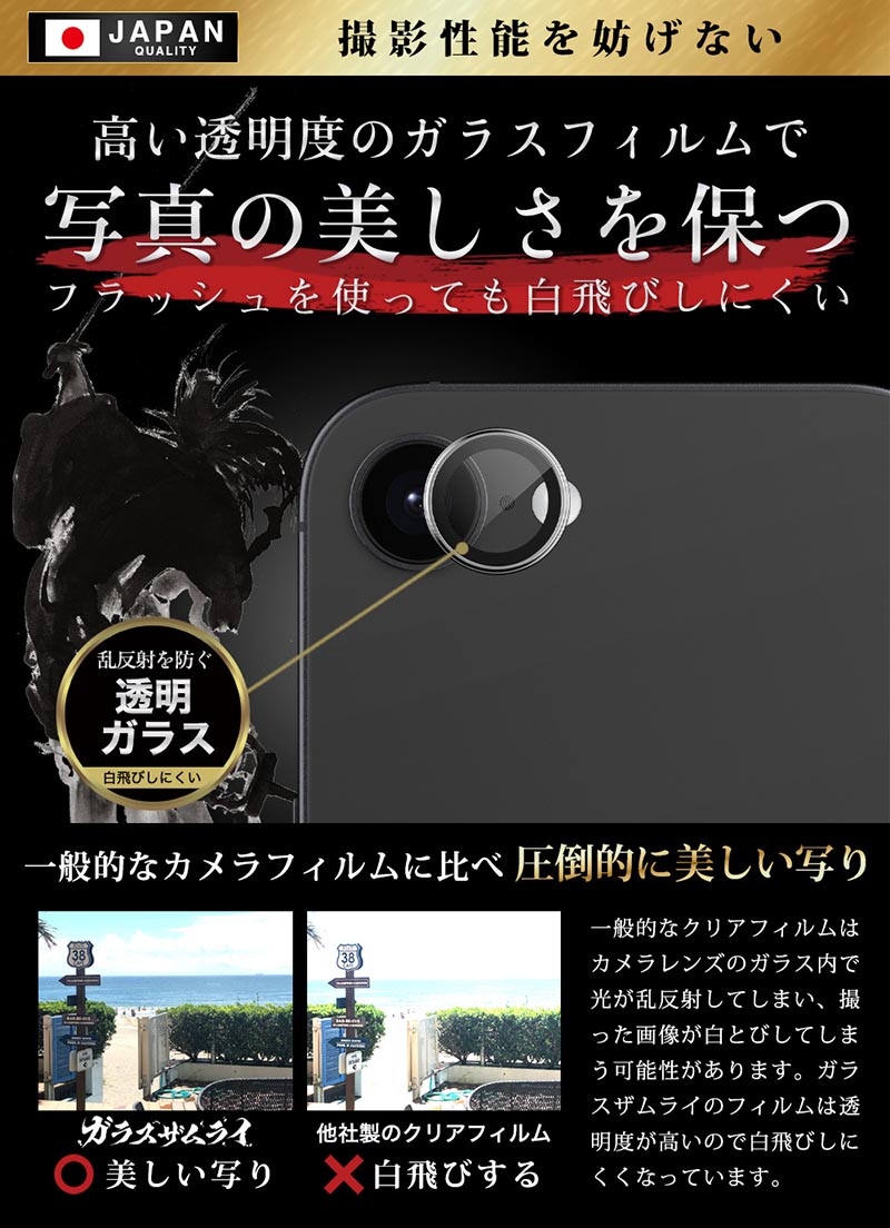 | 白飛び防止のブラックリング加工 | フラッシュを使っても白飛びしにくいブラックリング加工で圧倒的に美しい写りに。一般的なクリアフィルムはカメラレンズのガラス内で光が乱反射してしまい、撮った画像が白とびしてしまう可能性があります。他店のパンダタイプフィルムでは画像に影を作るという場合がありますがガラスザムライのフィルムは影が入りません。 |