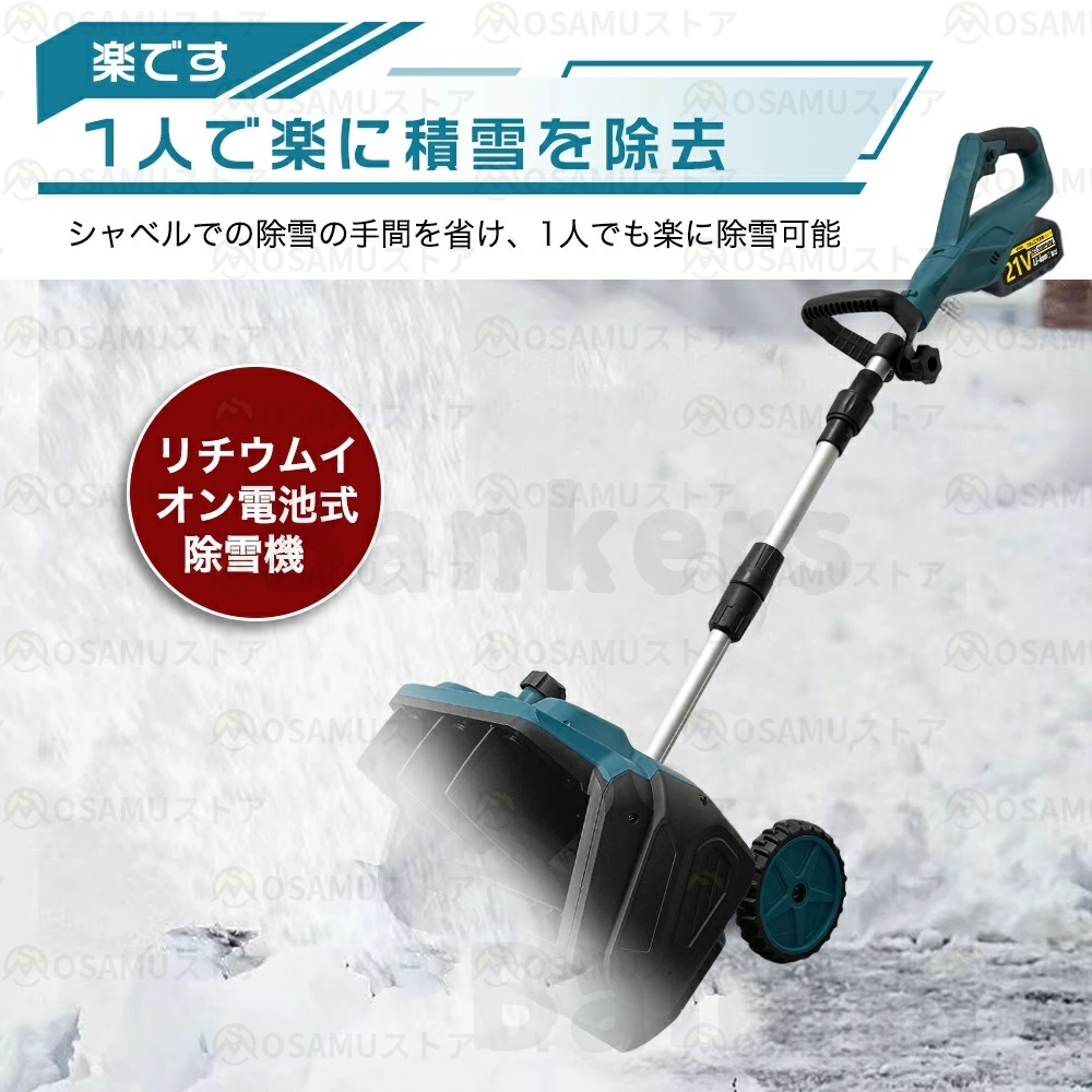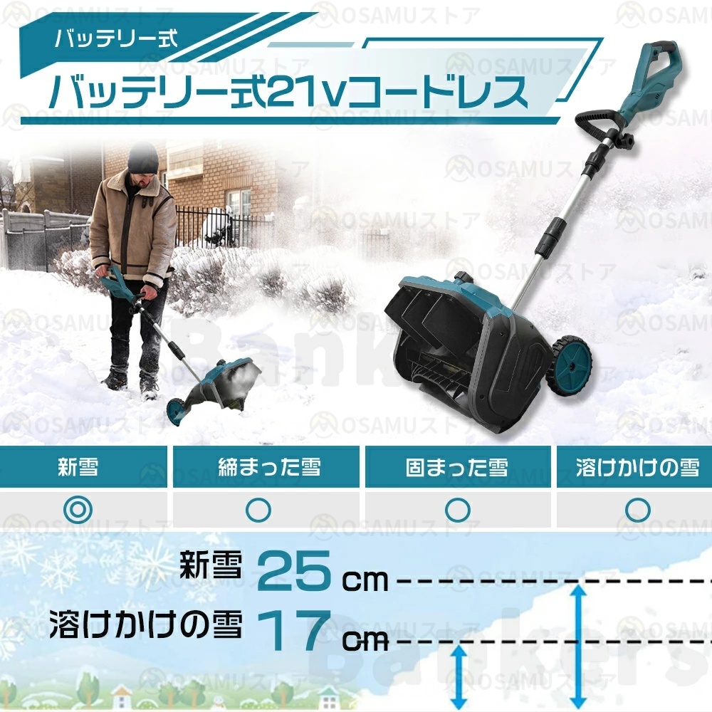 A:このコードレス雪かきシャベルは、軽くふわふわした雪の除去に理想的で、最大処理可能な積雪深度は約17センチ(6.6インチ)です。【強力な除雪性能】