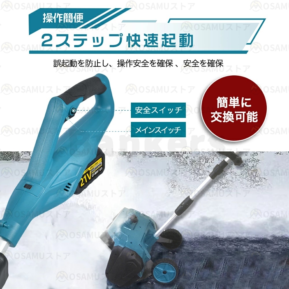 電動除雪機には4.0 Ahの大容量バッテリーが搭載されています。高性能バッテリーにより、長時間の作業が可能で、一回の充電で最大30分間稼働します。これにより、柔軟性が向上し、頻繁な充電が不要になり、ユーザーにとってより便利です。