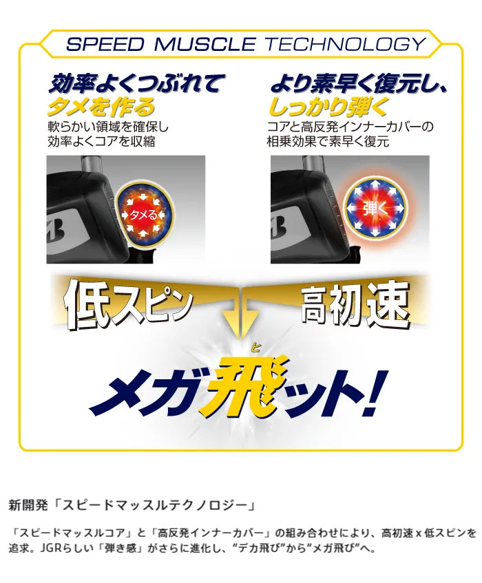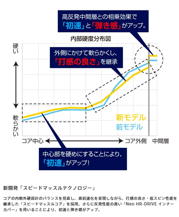 ゴルフボールの効率的な「つぶれ」と素早い復元による「弾き」を進化させる。