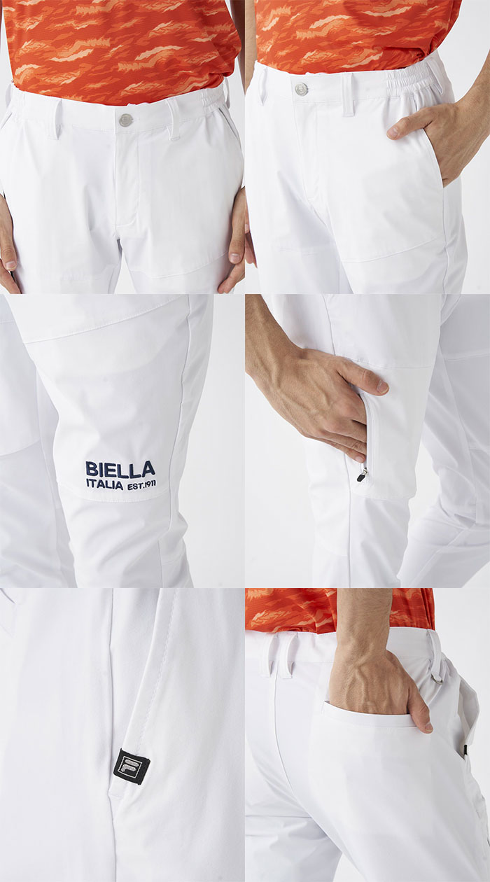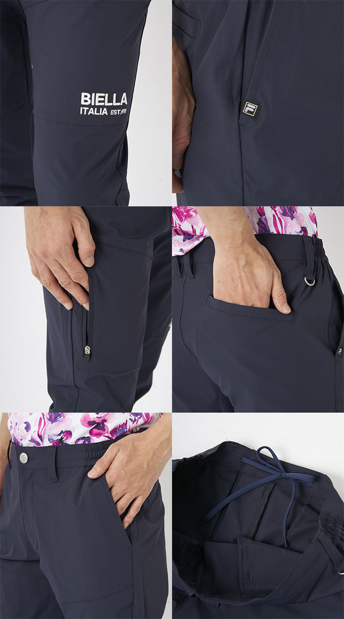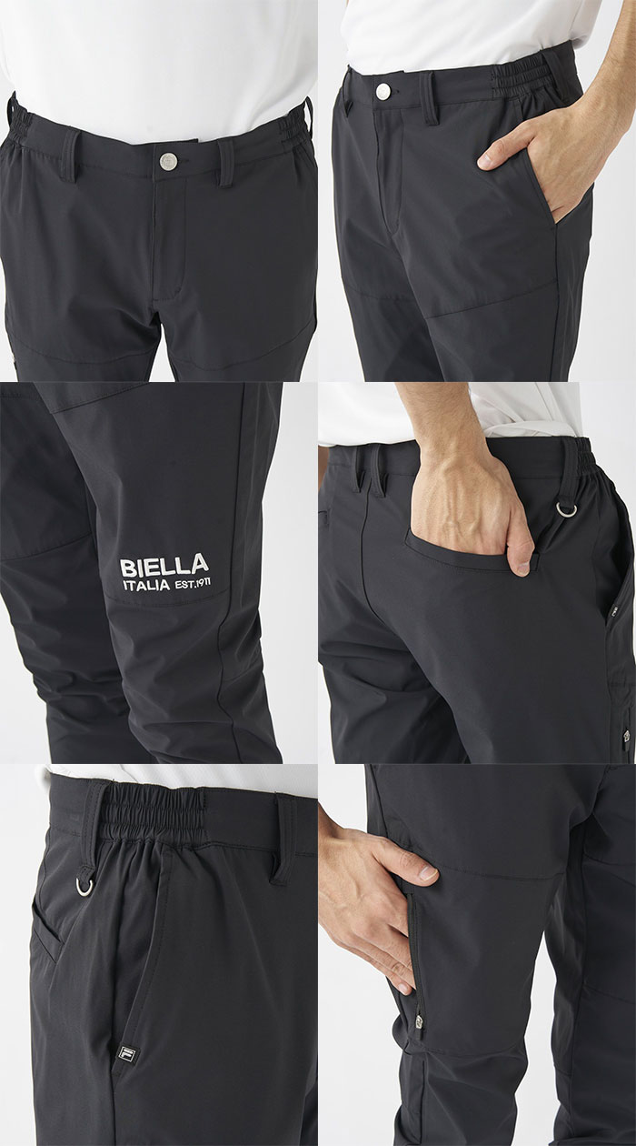 シンプルながらも洗練されたデザインで、左腿部分に「BIELLA ITALIA EST. 1911」のロゴが施されており、スポーティーな印象を演出しています。