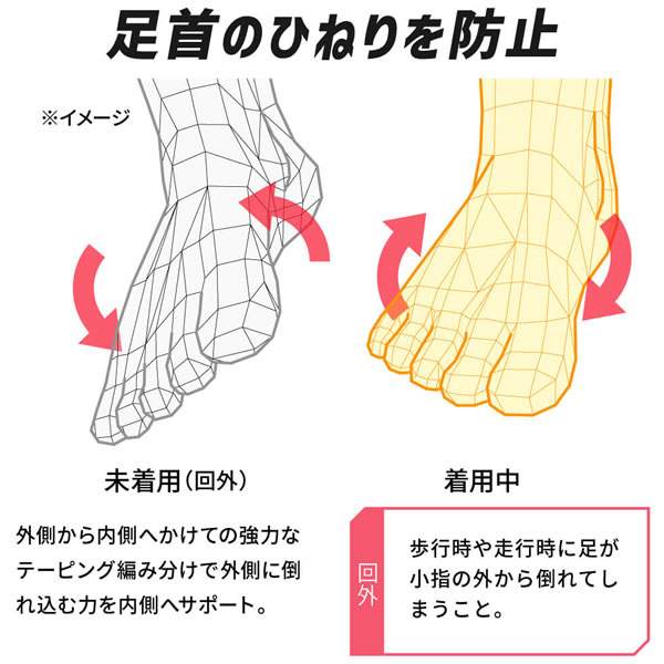 特許取得の編み組織が可能にする足首の安定感、足指を強く使える足袋形状が生む質の高いサポート性。