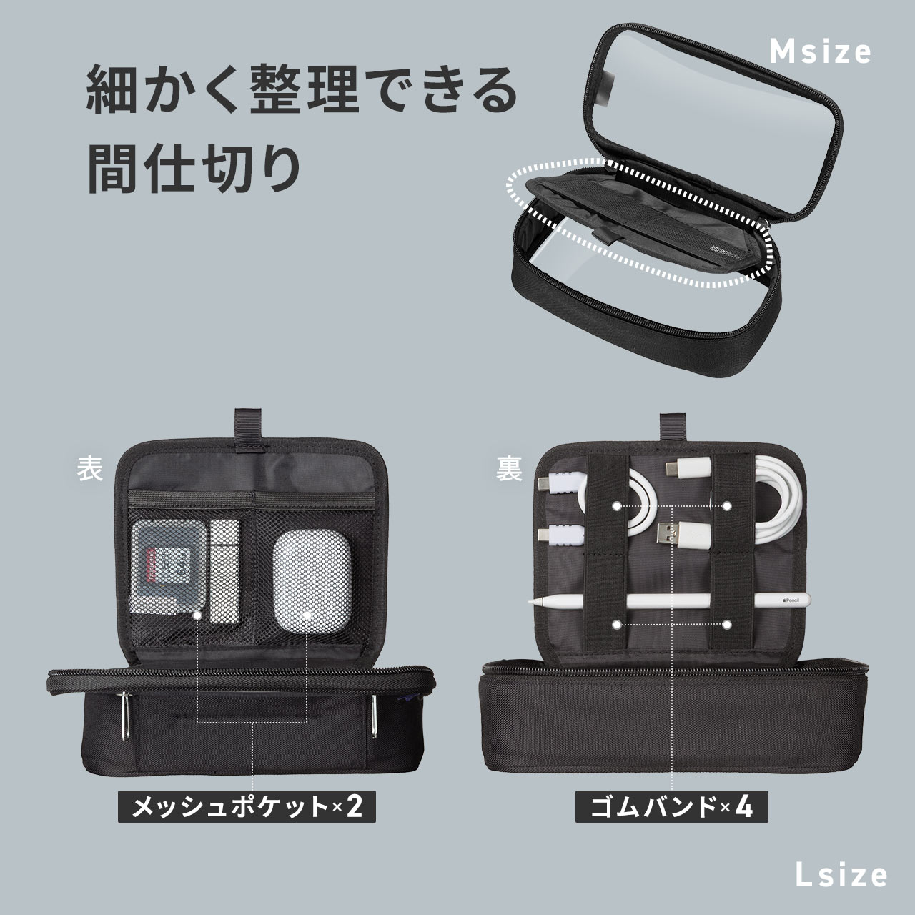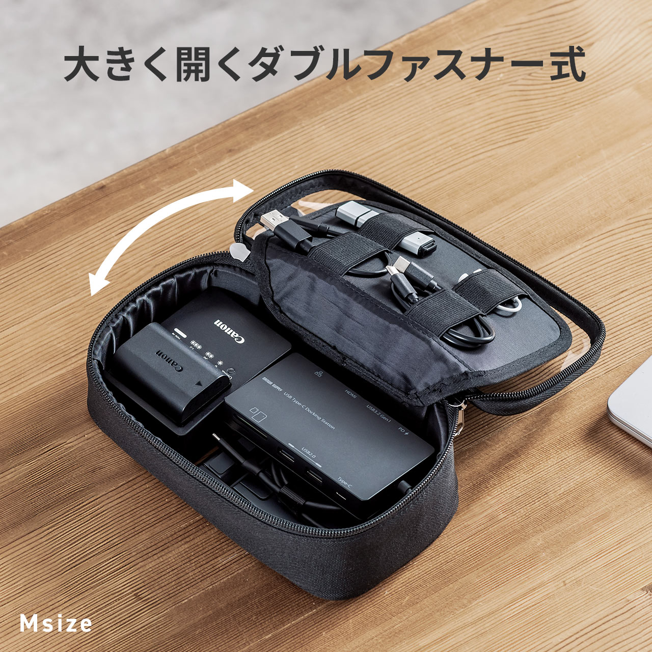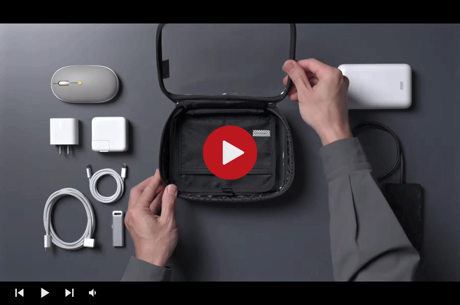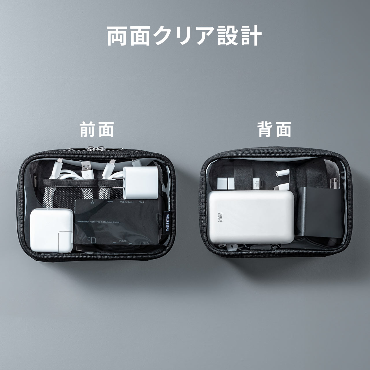 中身がひと目で分かり、探す手間を減らせるクリア素材のガジェットポーチ。表裏ともに透明で開けずに収納物を確認できる。ダブルファスナーで大きく開き、ACアダプタやバッテリー、マウスも整理収納。出張や旅行、トラベルポーチとしても活用できる収納ケース。Lサイズ。