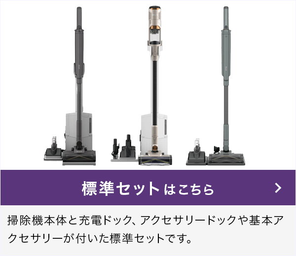 あらゆる床も家具上もしっかりきれいに。パワフルな掃除力とシンプル操作で、手軽に使えるコードレススティッククリーナー。 都度のゴミ捨てから解放される自動ゴミ収集ドック付きモデル。プレシジョンダスター、ソフトブラシ、スクラビングブラシが追加されたオンラインストア限定セット。