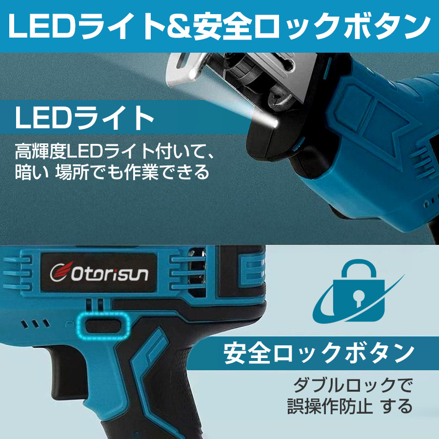 セキュリティロックボタンは、誤って操作して自分を傷つけないようにするために設計されています。 セーフティロックボタンとトリガスイッチを押してから、レシプロソーを操作します。