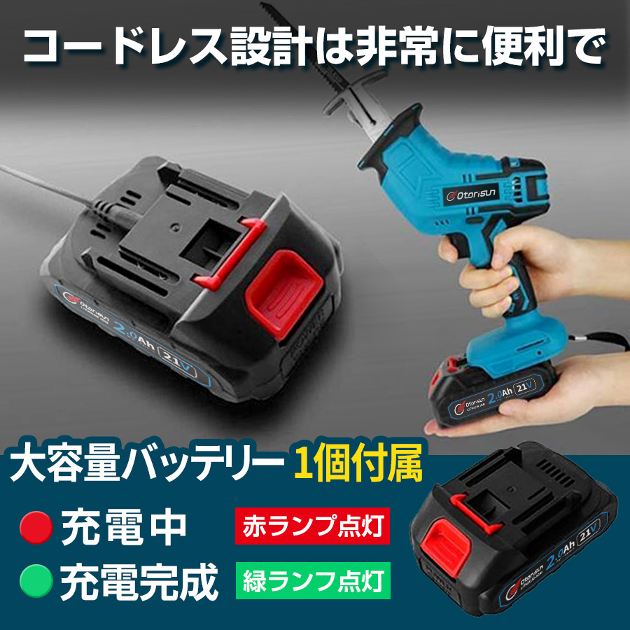 1個電池を付き、簡単に取り付けできます,いつでもどこでも使いたい時に使える。【21V高速切断可能】充電式レシプロソーのコードレス設計は非常に便利で、どこでも使用できます。3000RPM高速ストローク&無段変速機構、高速ストローク、従来品と比較して切断スピードが約20%アップしました。