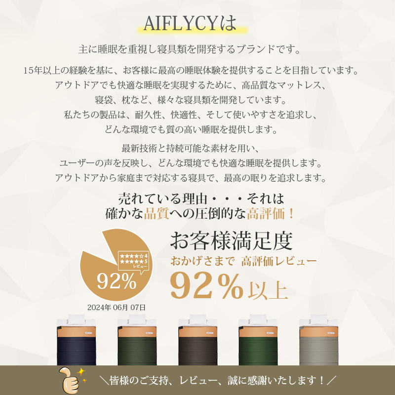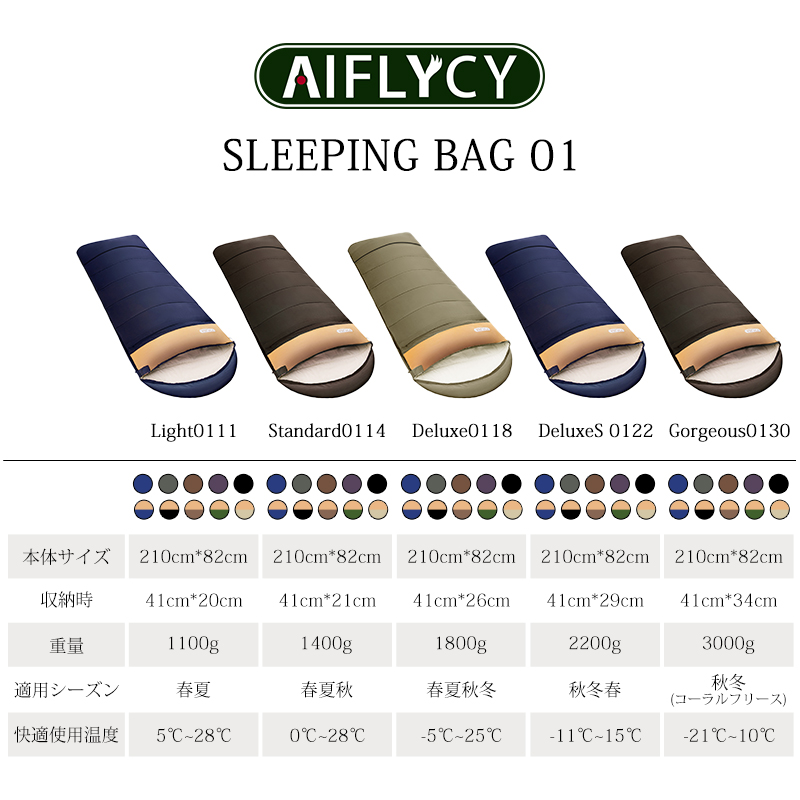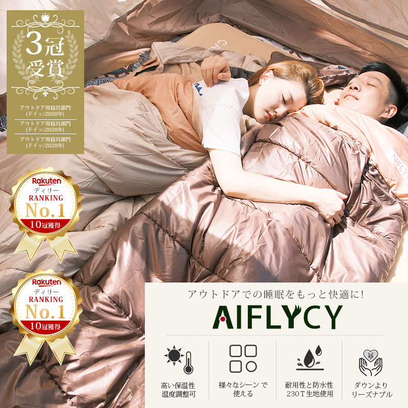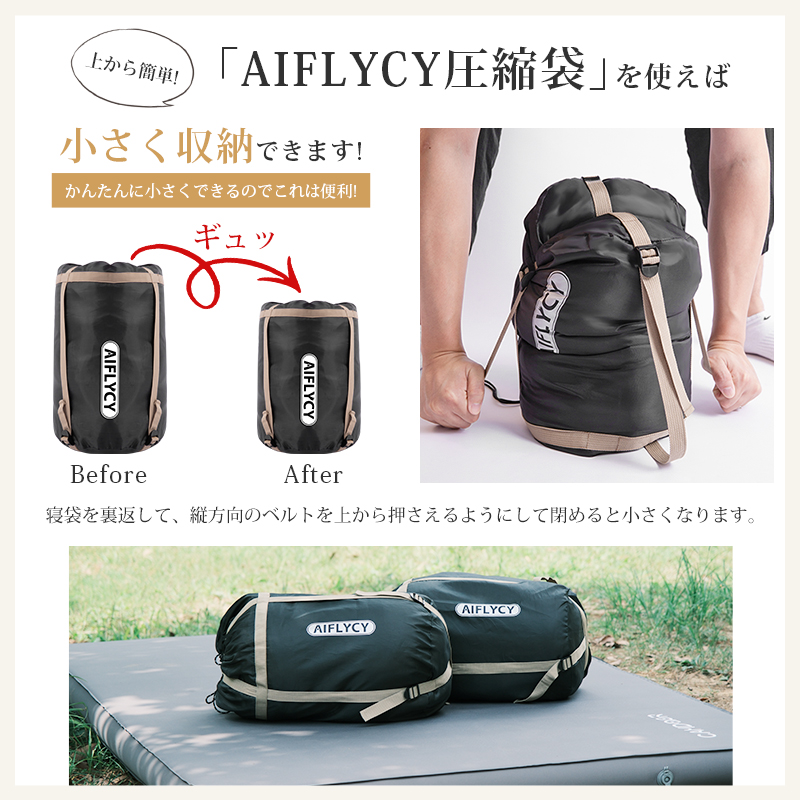 | 【AIFLYCY&新デザイン封筒型寝袋】 ✅ガイドファブリク設計 ・最新裁縫技術 【満足できる11個の理由】 ・保温性優れたともに軽く 【POINT.1 最新裁縫技術】 最新裁縫技術を採用 【POINT.2 優れた生地】 防水性の優れた300Tポリエステル生地を採用し、保温性、速乾性と快適さをすべて満足。 中綿を3Dファイバー製中空化学繊維を使用!