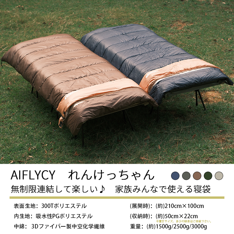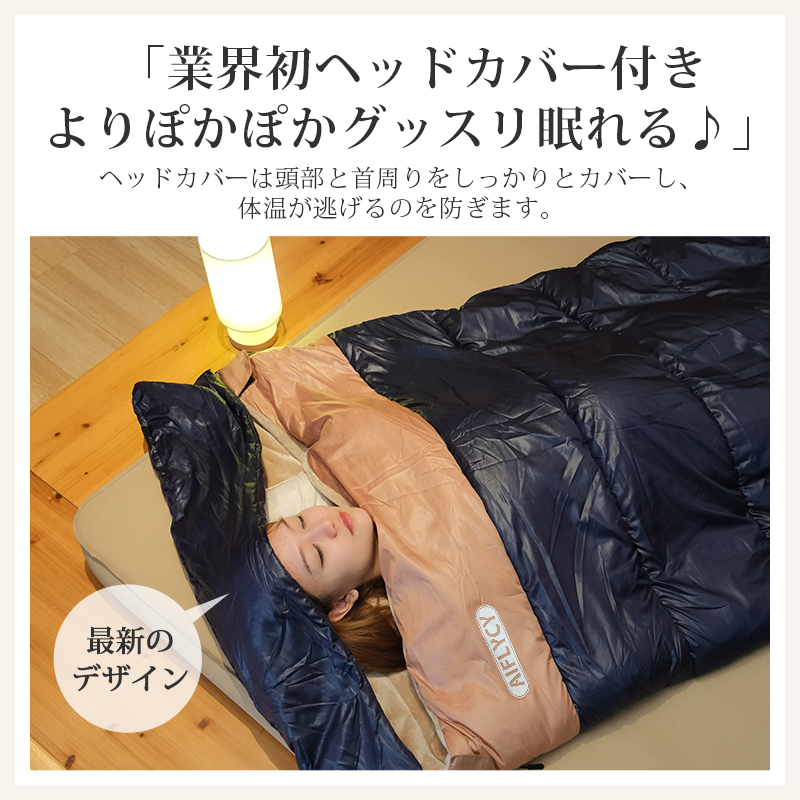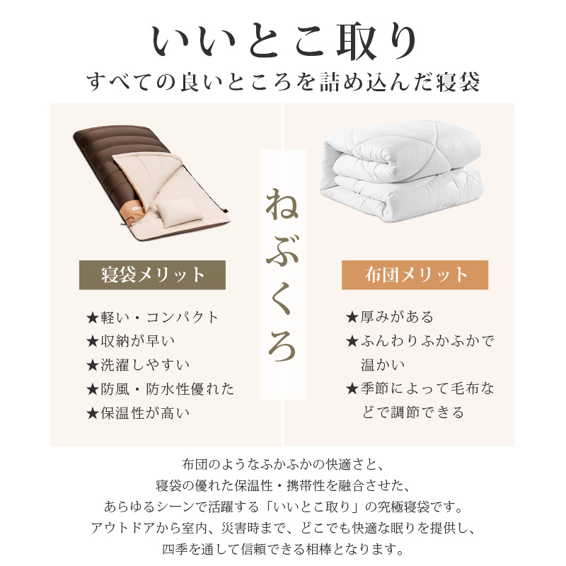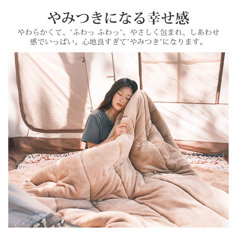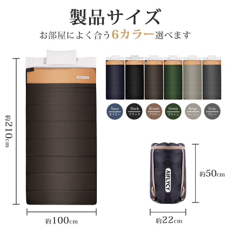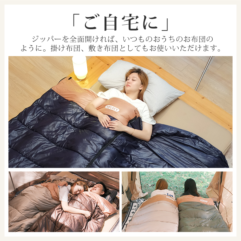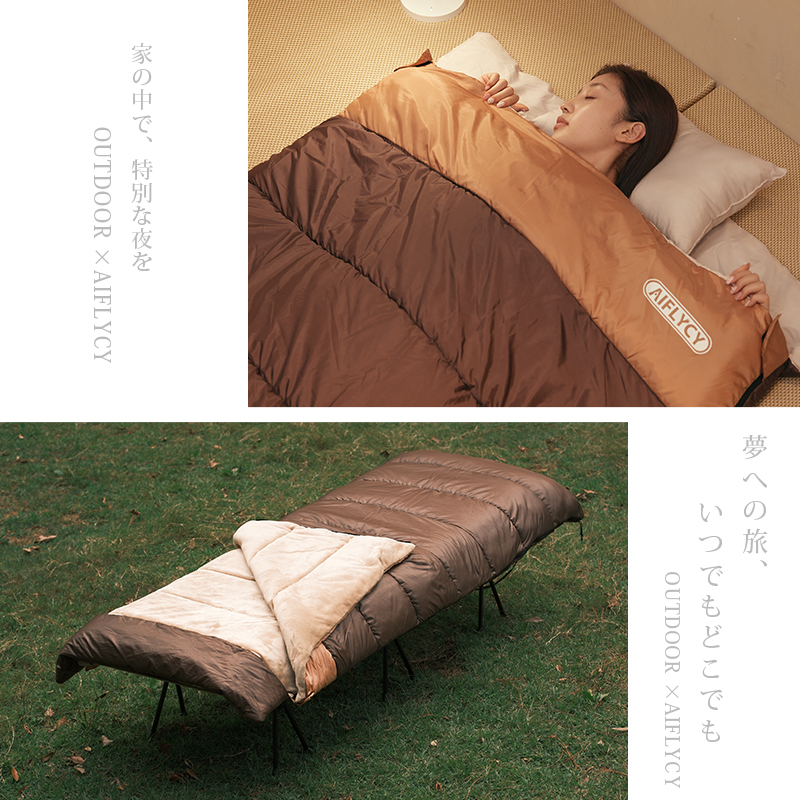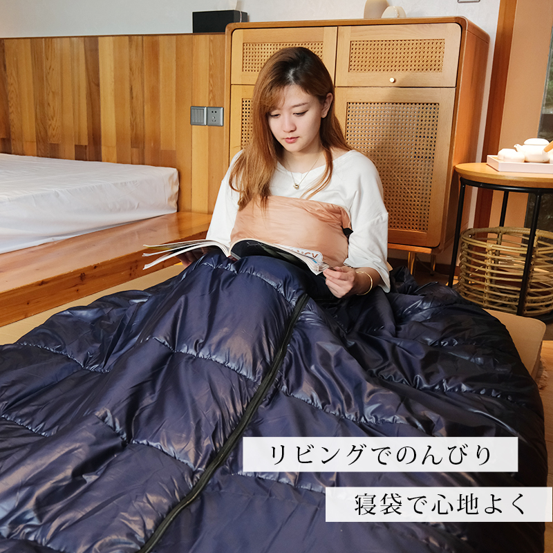 無制限のレイアウトができます、ご家族5人で寝袋三つのレイアウトでも使用が楽々◎ 【POINT.5 持ち運び】 中綿を3Dファイバー製中空化学繊維を採用、保温性優れた上に軽量でコンパクト。 【POINT.6 内部多機能ポケット】 内部多機能ポケットには携帯や貴重品などを入れていただけます。 【POINT.7 余裕のあるサイズ設計】 展開時:幅100cm 寝袋として余裕のあるサイズ設計、幅が広いので寝返りしやすい。 【POINT.8 両面ファスナー採用】 両面ファスナーを採用し、外部も同じく、内部からでも簡単に開閉できます。 【POINT.9 丸洗いOK】 中綿は3Dファイバー製中空化学繊維使用している、型崩れしにくく、洗濯しても伸び縮みしにくい繊維です。 【POINT.10 使用方法多様】 「掛け」「敷き」を分離できる、布団のようにご使用いただくことも出来ます。 【POINT.11 足カバー設計】 唯一足カバー付きの寝袋 【カラーバリエーション】 ベージュ×ブラウン、ベージュ×ネイビー、ベージュ×ブラック 【よくあるご質問】 ・冬には使えませんか? | ||