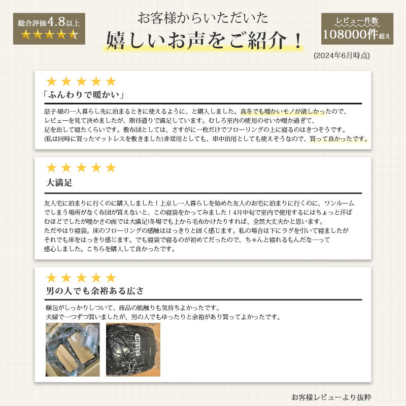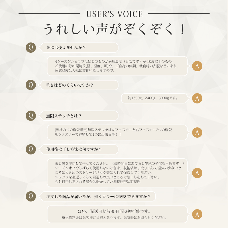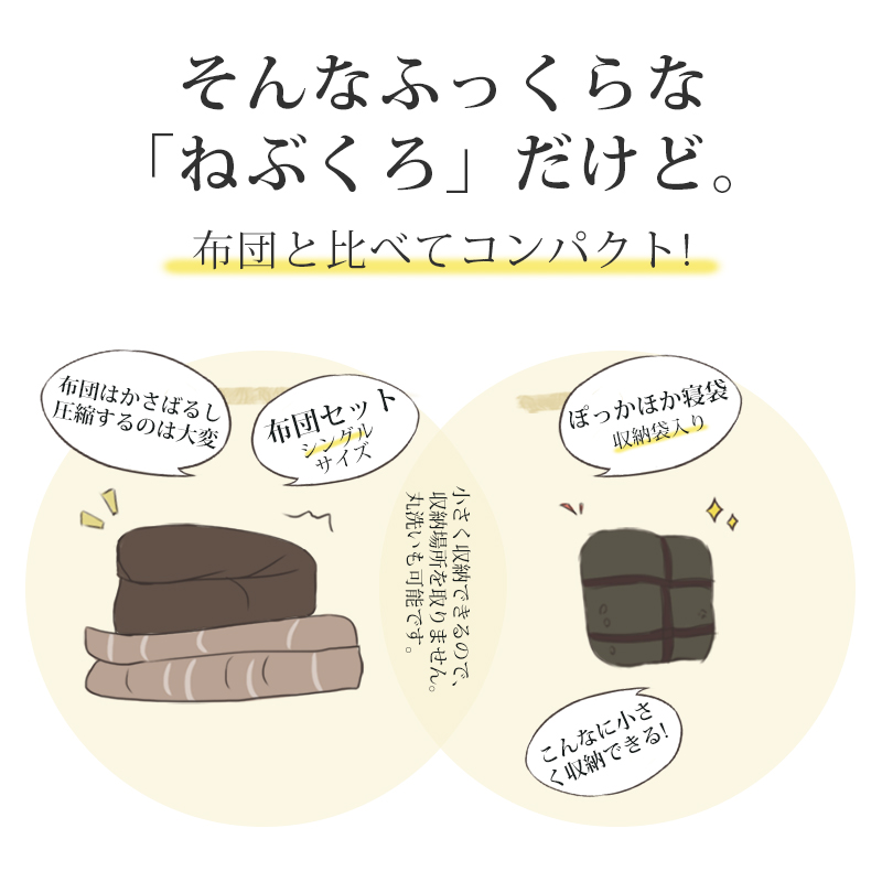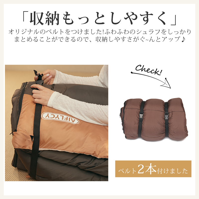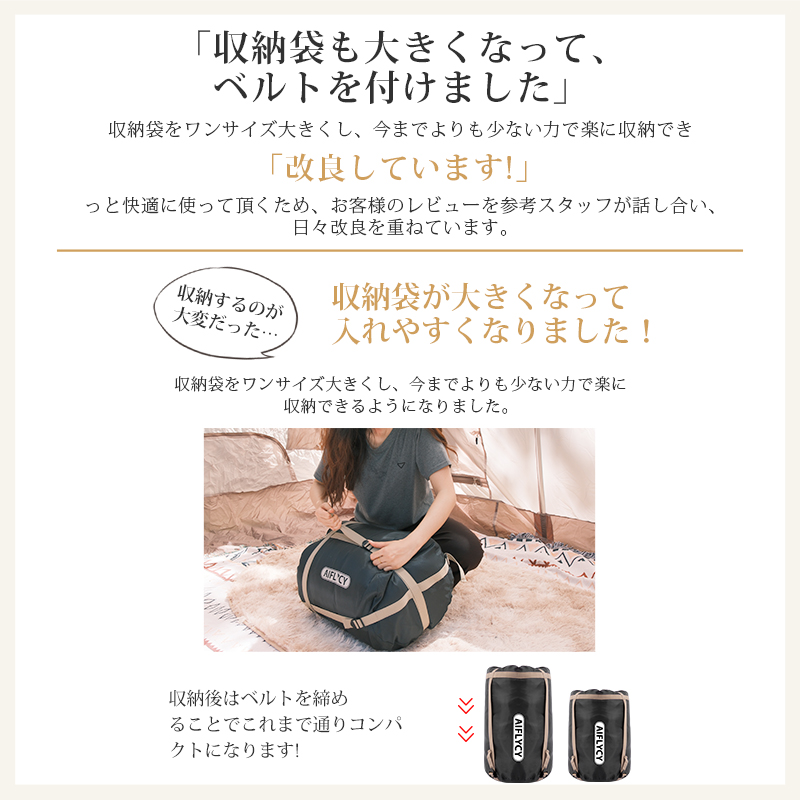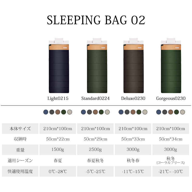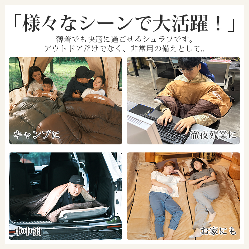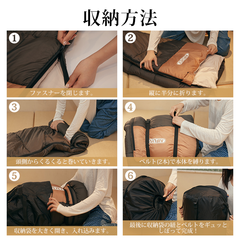 無制限のレイアウトができます、ご家族5人で寝袋三つのレイアウトでも使用が楽々◎ 【POINT.5 持ち運び】 中綿を3Dファイバー製中空化学繊維を採用、保温性優れた上に軽量でコンパクト。 【POINT.6 内部多機能ポケット】 内部多機能ポケットには携帯や貴重品などを入れていただけます。 【POINT.7 余裕のあるサイズ設計】 展開時:幅100cm 寝袋として余裕のあるサイズ設計、幅が広いので寝返りしやすい。 【POINT.8 両面ファスナー採用】 両面ファスナーを採用し、外部も同じく、内部からでも簡単に開閉できます。 【POINT.9 丸洗いOK】 中綿は3Dファイバー製中空化学繊維使用している、型崩れしにくく、洗濯しても伸び縮みしにくい繊維です。 【POINT.10 使用方法多様】 「掛け」「敷き」を分離できる、布団のようにご使用いただくことも出来ます。 【POINT.11 足カバー設計】 唯一足カバー付きの寝袋 【カラーバリエーション】 ベージュ×ブラウン、ベージュ×ネイビー、ベージュ×ブラック 【よくあるご質問】 ・冬には使えませんか? | ||