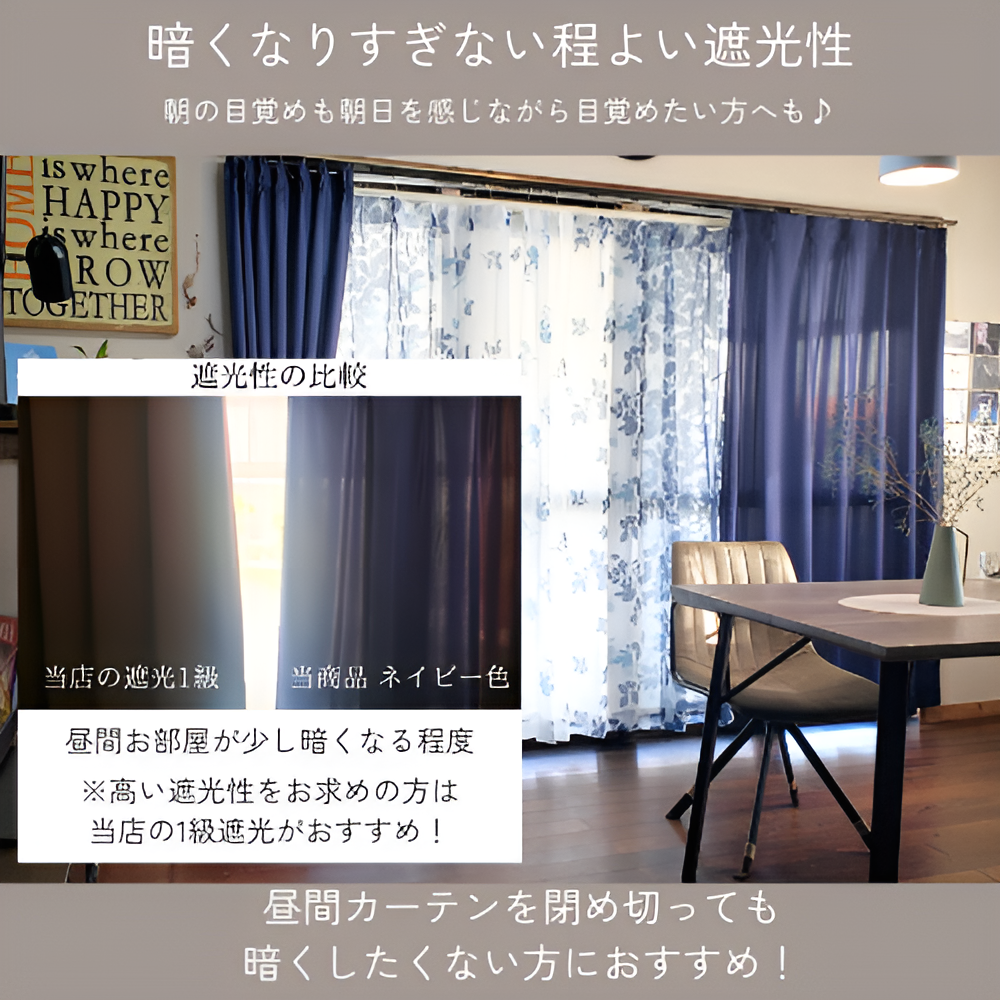 遮光性(ネイビー3級遮光、他等級なし、光は意外と入ります。)