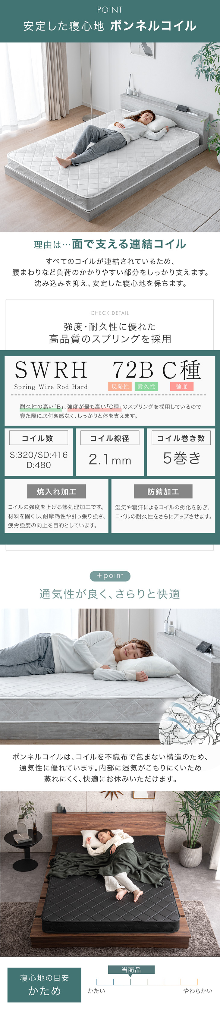 内部: ボンネルコイルスプリング (線径2.1mm)