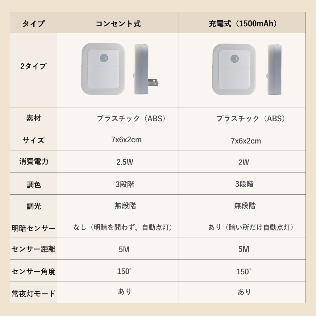 *コンセント式は明暗センサーが搭載されていないため、昼夜を問わず、人やペットが感知エリアに入るとライトが点灯します。