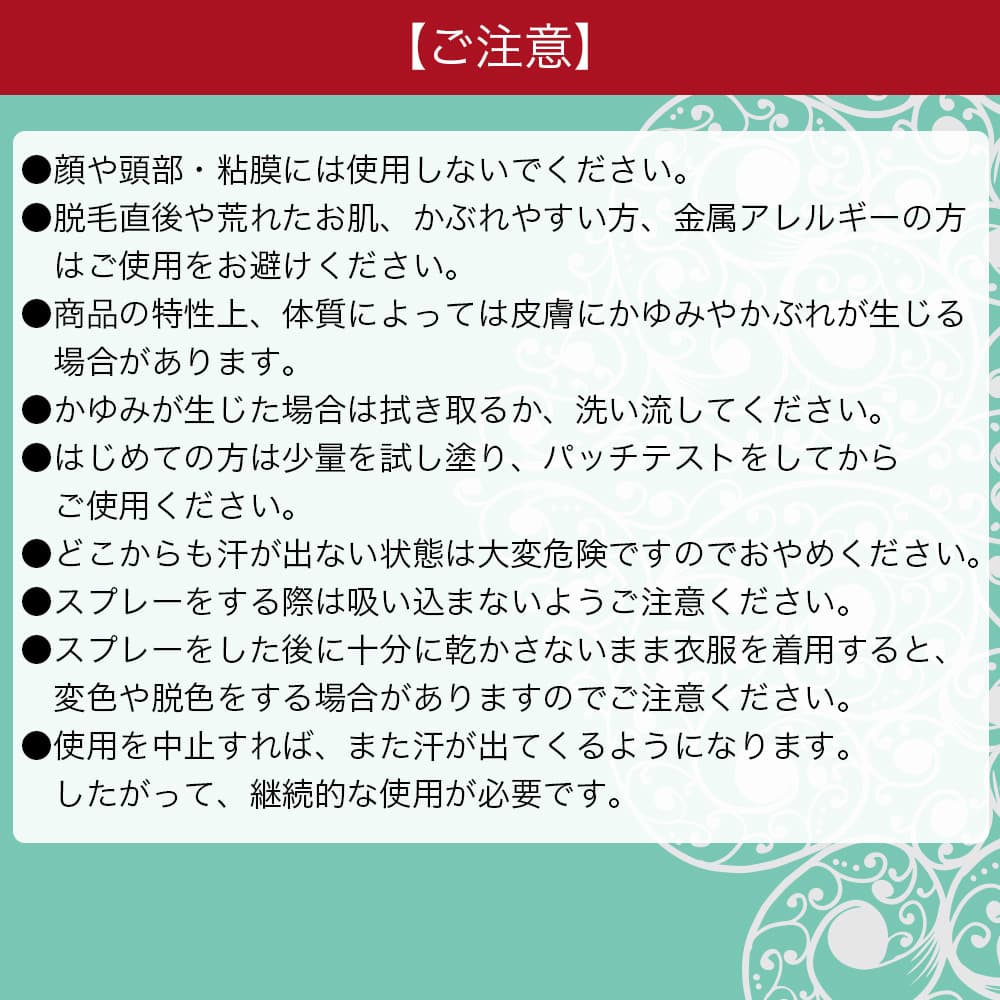 ●塗布後は必ず十分に乾燥させ、その後30分程度は汗をかかない状態を維持してください。