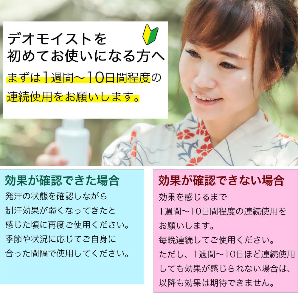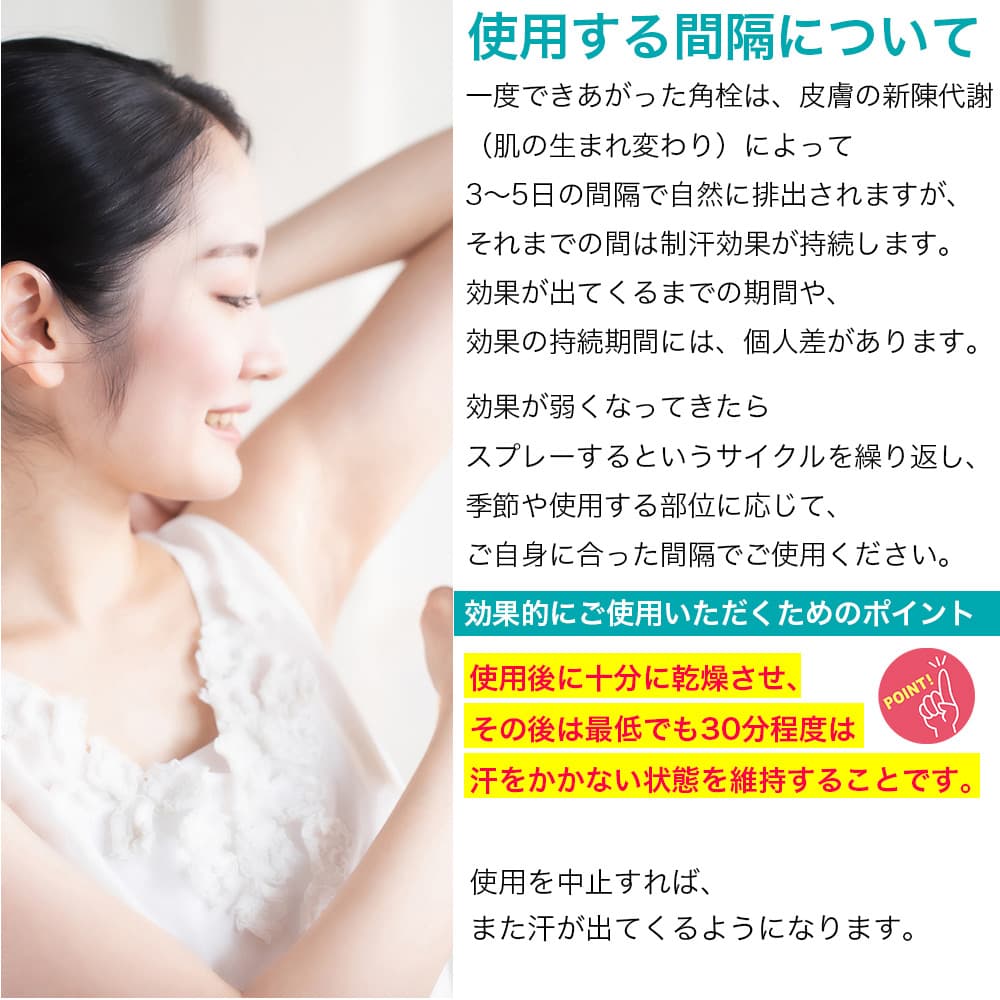 腋下など汗のかきやすい部分を清潔に洗浄した後、適量スプレーして手指で充分に塗布してください。
