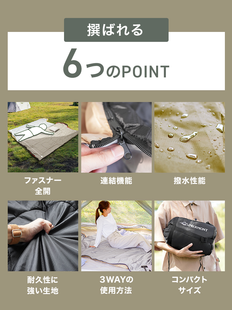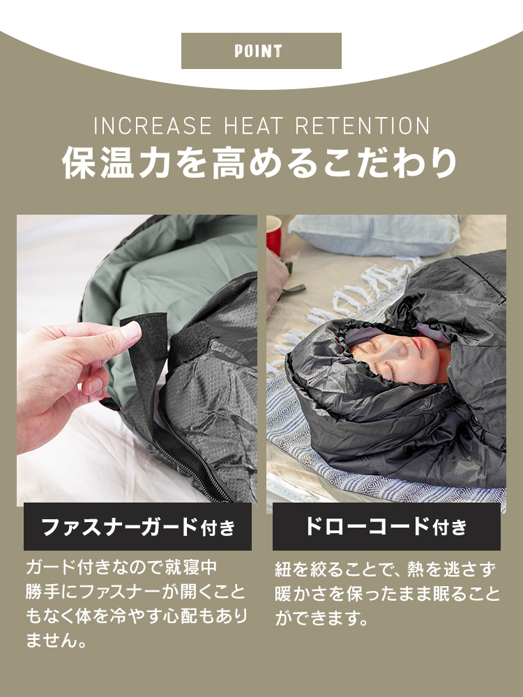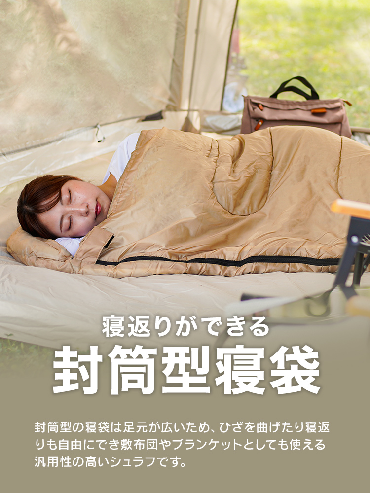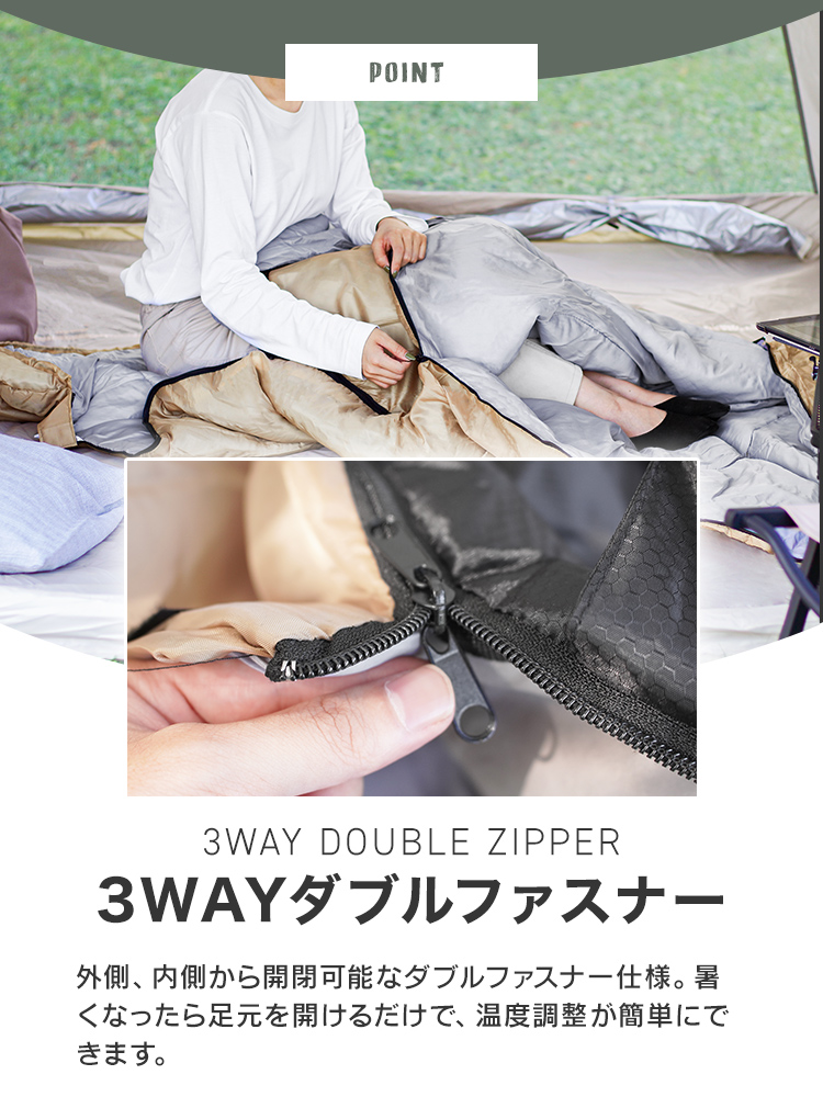 封筒型&ダブルジッパー仕様で足元から開閉でき、温度調整も簡単です。