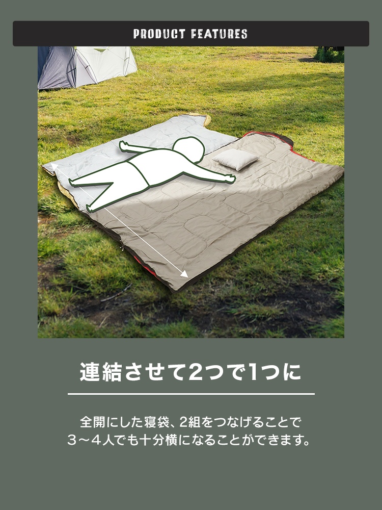 ふんわり柔らかく肌触りもなめらかで、寝袋に入った瞬間から暖かさを感じられます。